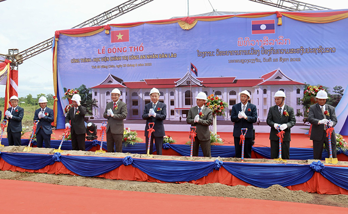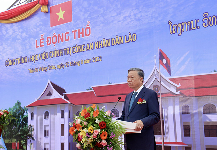 Tiếp tục các hoạt động trong khuôn khổ chuyến thăm, làm việc tại CHDCND Lào theo lời mời của Đại tướng Vilay Lakhamphong, Ủy viên Bộ Chính trị, Phó Thủ tướng, Bộ trưởng Bộ Công an Lào, sáng 25/8, Đại tướng Tô Lâm, Ủy viên Bộ Chính trị, Bộ trưởng Bộ Công an Việt Nam cùng Đoàn đại biểu cấp cao Bộ Công an Việt Nam đã tới dự Lễ động thổ xây dựng Học viện Chính trị CAND Lào. Cùng dự buổi lễ có Phó Thủ tướng, Bộ trưởng Bộ Công an Lào Vilay Lakhamphong.