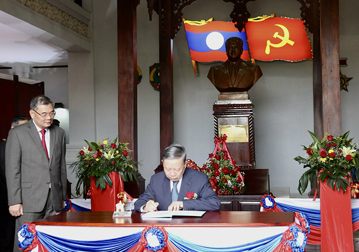 Chiều cùng ngày, Bộ trưởng Tô Lâm cùng Đoàn đại biểu cấp cao Bộ Công an Việt Nam đã tới thăm Đại sứ quán Việt Nam tại Lào và Cơ quan đại diện Bộ Công an Việt Nam tại Lào.