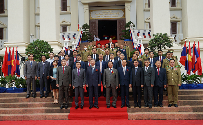 Bộ trưởng Tô Lâm và Đoàn tại trụ sở Cơ quan đại diện Bộ Công an Việt Nam tại Lào. Ảnh: Trịnh Quốc Dũng.