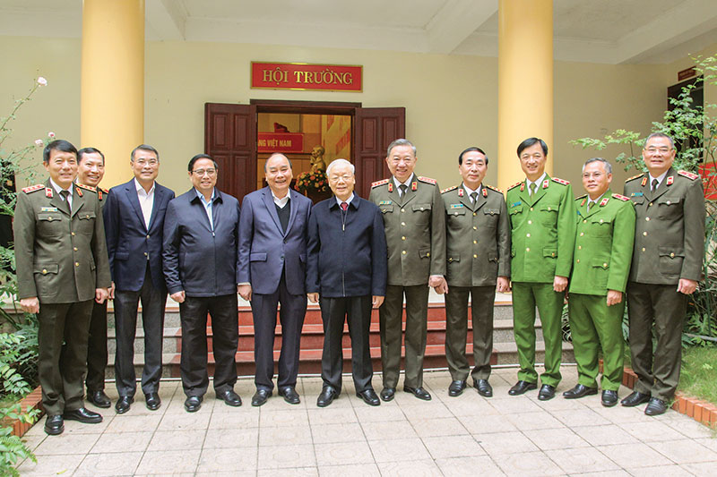 Tổng Bí thư Nguyễn Phú Trọng, Chủ tịch nước Nguyễn Xuân Phúc, Thủ tướng Chính phủ Phạm Minh Chính, Bộ trưởng Tô Lâm và các đại biểu dự Hội nghị Đảng ủy Công an Trung ương, ngày 7/12/2022.