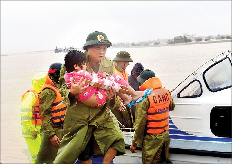 Lực lượng Công an giúp dân sơ tán trong mưa lũ.
