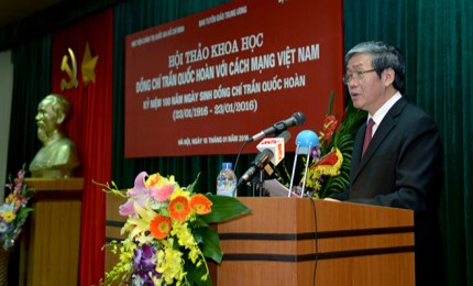 Nhân dịp kỷ niệm 100 năm Ngày sinh đồng chí Trần Quốc Hoàn (23/01/1916-23/01/2016), sáng ngày 15/01, tại Hà Nội, Bộ Công an đã phối hợp với Học viện Chính trị quốc gia Hồ Chí Minh chủ trì phối hợp với Ban Tuyên giáo Trung ương long trọng tổ chức Hội thảo khoa học “Đồng chí Trần Quốc Hoàn với cách mạng Việt Nam”. Đồng chí Đinh Thế Huynh, Ủy viên Bộ Chính trị, Bí thư Trung ương Đảng, Trưởng Ban Tuyên giáo Trung ương đến dự và chỉ đạo Hội thảo.