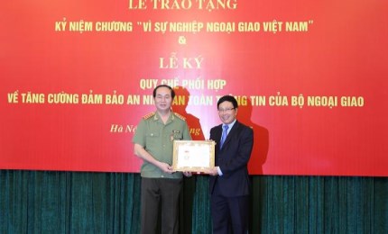 Chiều 7/9/2015, tại Hà Nội, Bộ Ngoại giao tổ chức Lễ trao tặng Kỷ niệm chương “Vì sự nghiệp ngoại giao Việt Nam” cho các đồng chí lãnh đạo Bộ Công an; Ký Quý chế phối hợp giữa 2 Bộ về tăng cường đảm bảo an ninh, an toàn thông tin của Bộ Ngoại giao.