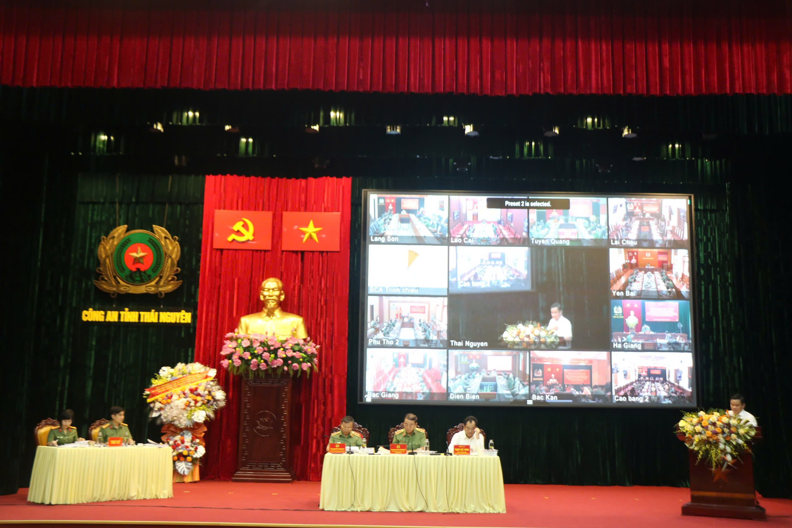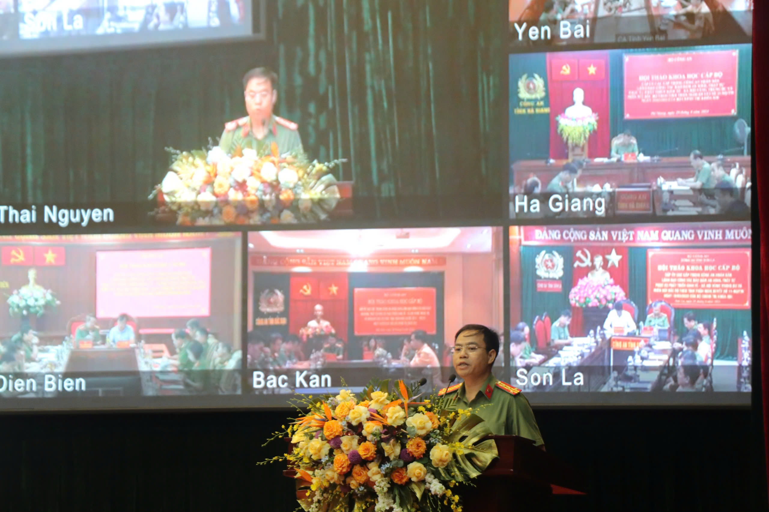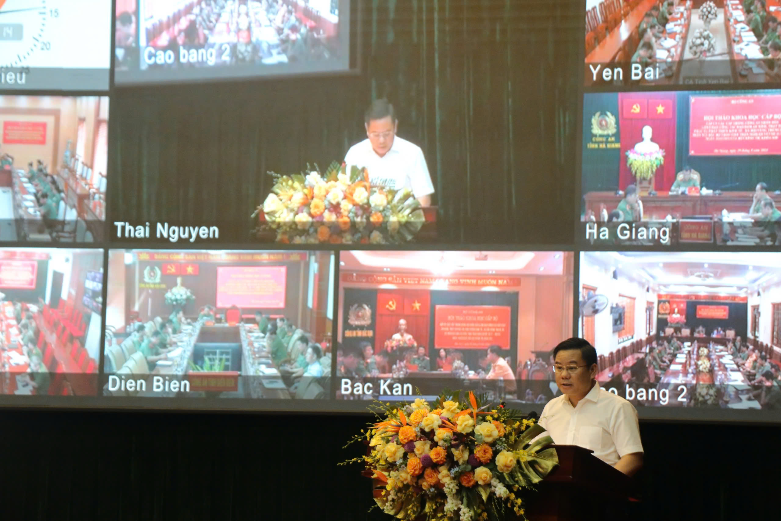 Về đại biểu tham dự tại điểm cầu Công an 13 địa phương trong vùng có: đồng chí Nguyễn Mạnh Dũng, Quyền Bí thư tỉnh ủy Hà Giang; đồng chí Vũ Mạnh Hà, Ủy viên dự khuyết Ban Chấp hành Trung ương Đảng, Phó Bí thư thường trực tỉnh ủy Lai Châu; đồng chí Lê Thị Kim Dung, Phó Bí thư thường trực tỉnh ủy, Chủ tịch Hội đồng nhân dân tỉnh Tuyên Quang; đồng chí Phương Thị Thanh, Phó Bí thư thường trực tỉnh ủy Bắc Kạn; đồng chí Vừ A Bằng, Tỉnh ủy viên, Phó Chủ tịch Ủy ban nhân dân tỉnh Điện Biên; đồng chí Lương Trọng Quỳnh, Tỉnh Ủy viên, Phó Chủ tịch Ủy ban nhân dân tỉnh Lạng Sơn; đồng chí Quách Tất Liêm, Tỉnh Ủy viên, Phó Chủ tịch Ủy ban nhân dân tỉnh Hòa Bình; đồng chí Bùi Minh Tân, Ủy viên Ban Thường vụ Tỉnh ủy, Trưởng Ban Nội chính Tỉnh ủy Sơn La cùng đại diện các sở, ban, ngành, Ban Giám đốc và các phòng chức năng Công an các tỉnh.