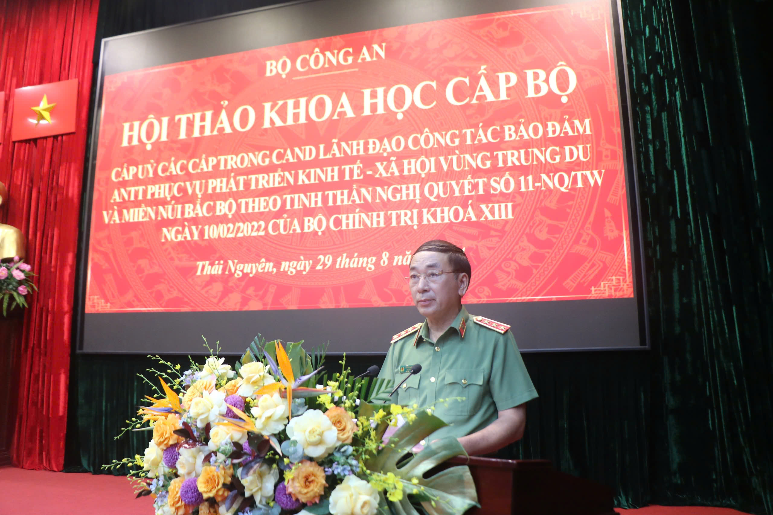 Ngày 29/8/2024, tại Công an tỉnh Thái Nguyên, Bộ Công an phối hợp với Tỉnh ủy Thái Nguyên tổ chức Hội thảo khoa học cấp Bộ “Cấp uỷ các cấp trong Công an nhân dân lãnh đạo công tác bảo đảm an ninh, trật tự phục vụ phát triển kinh tế - xã hội vùng trung du và miền núi Bắc Bộ theo tinh thần Nghị quyết số 11-NQ/TW ngày 10/02/2022 của Bộ Chính trị khoá XIII”. Đồng chí Thượng tướng, PGS.TS Trần Quốc Tỏ, Ủy viên Ban chấp hành Trung ương Đảng, Phó Bí Thư Đảng ủy CATW, Thứ trưởng Bộ Công an, Ủy viên Hội đồng Lý luận Trung ương, Trưởng ban Chỉ đạo Hội thảo dự và chỉ đạo Hội thảo.