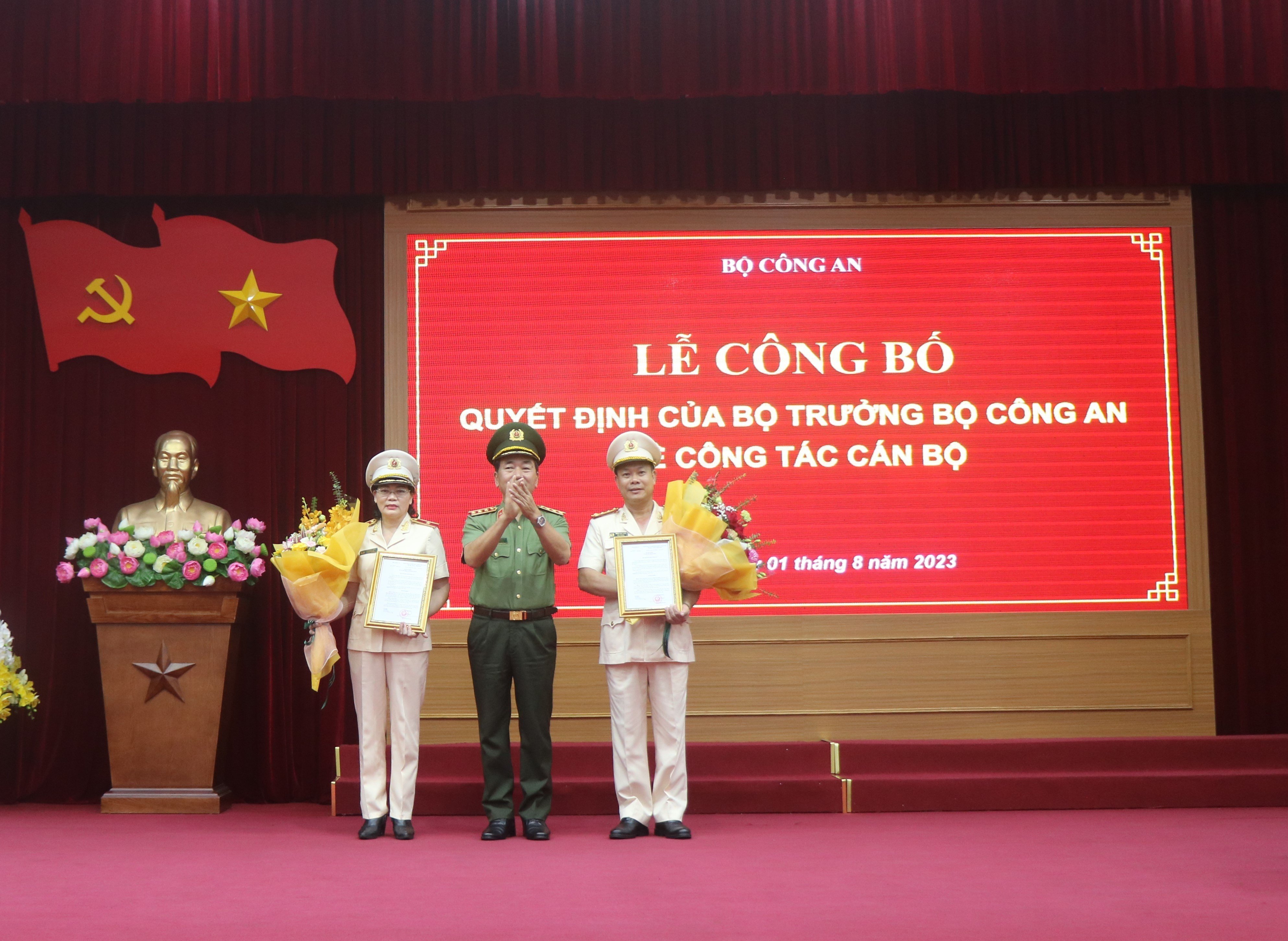 Thay mặt Đảng ủy Công an Trung ương, lãnh đạo Bộ Công an, Thứ trưởng Trần Quốc Tỏ trao quyết định và tặng hoa chúc mừng đồng chí Thiếu tướng Đinh Ngọc Hoa và Đại tá, TS Trần Văn Tuấn.