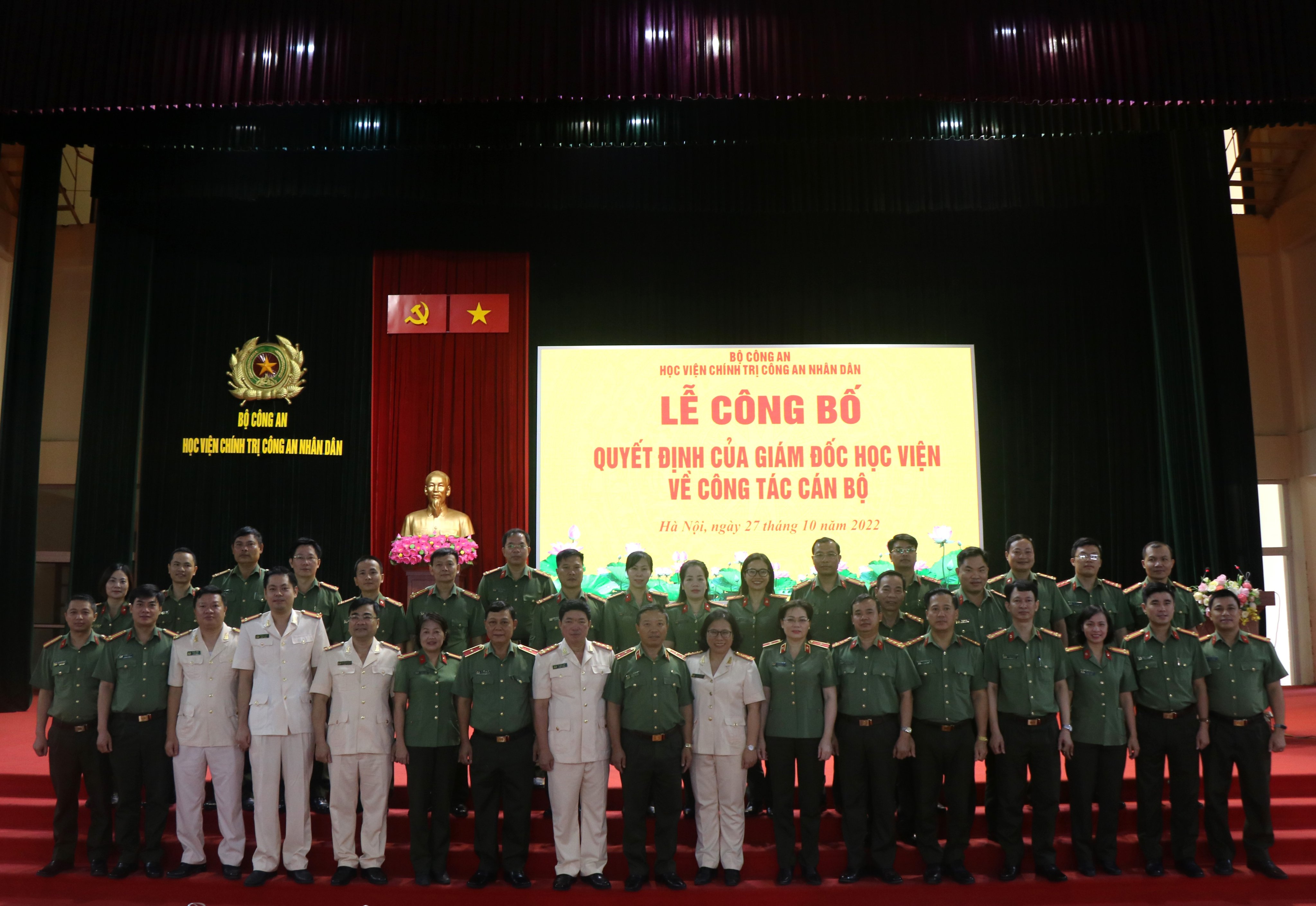 Căn cứ thông tư, hướng dẫn của Bộ trưởng Bộ Công an về quy định quy trình, thủ tục điều động, bổ nhiệm, bổ nhiệm lại cán bộ lãnh đạo, chỉ huy trong CAND, ngày 27/10/2022, Học viện Chính trị CAND đã tổ chức lễ công bố các quyết định của Giám đốc Học viện về việc bổ nhiệm lại các cán bộ quản lý cấp khoa, phòng thuộc Học viện. Đồng chí Trung tướng, PGS.TS Phan Xuân Tuy, Bí thư Đảng ủy, Giám đốc Học viện chủ trì buổi lễ. Tham dự có các đồng chí trong Đảng ủy, Ban Giám đốc Học viện; đại diện lãnh đạo các đơn vị thuộc Học viện.