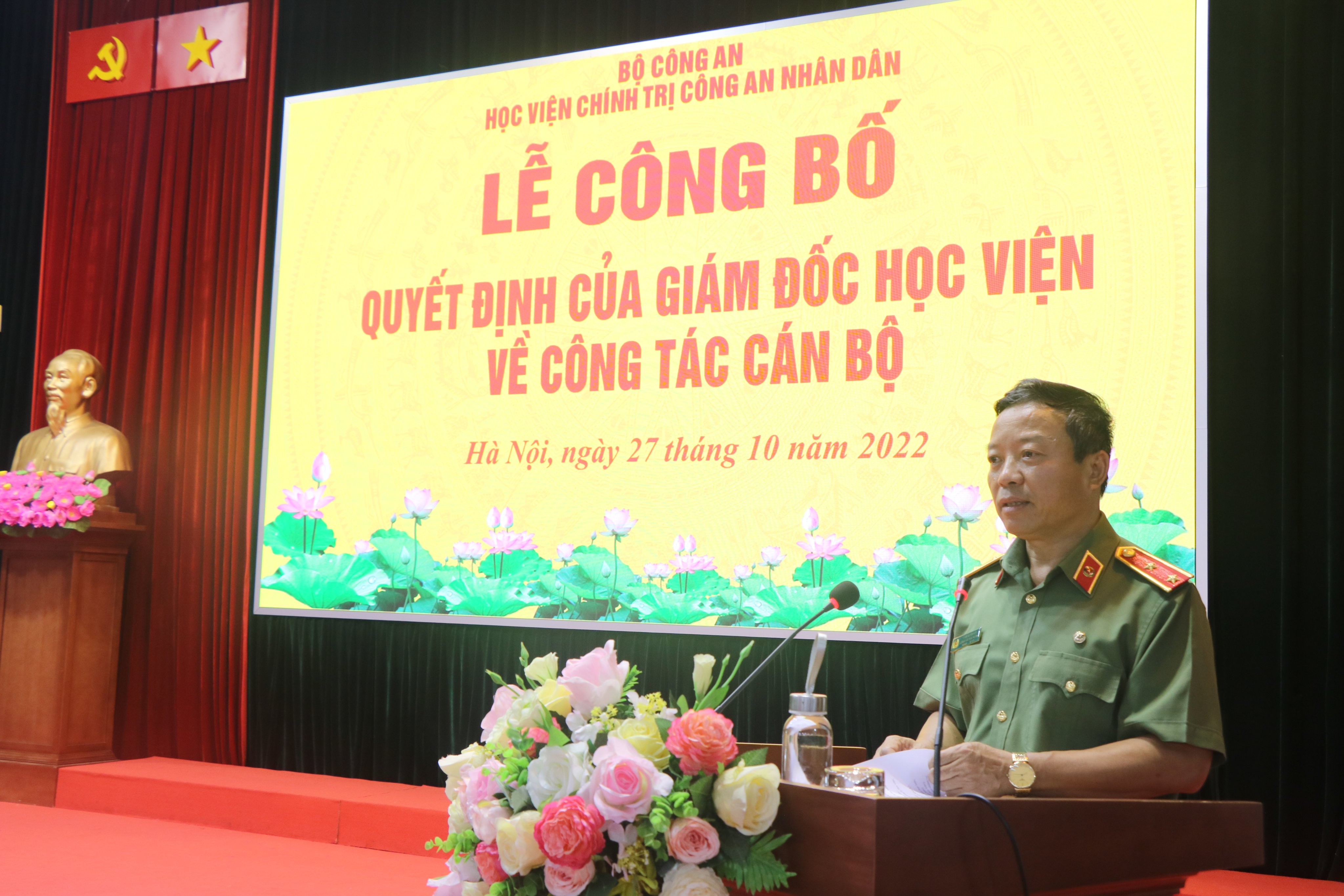 Đồng chí Trung tướng, PGS.TS Phan Xuân Tuy, Bí thư Đảng ủy, Giám đốc Học viện đại diện cho Đảng ủy, Ban Giám đốc Học viện long trọng trao quyết định bổ nhiệm lại cho từng đồng chí. Đồng thời gửi lời chúc mừng đến các đồng chí đã được tập thể đơn vị tín nhiệm, các cấp lãnh đạo tin tưởng giao trọng trách trên cương vị lãnh đạo quản lý. Đồng thời mong muốn trong thời gian tới, các đồng chí tiếp tục trau dồi kỹ năng quản lý, kinh nghiệm và nghiệp vụ; phát huy tinh thần phê bình, tự phê bình; đặt lợi ích tập thể lên trên hết, gương mẫu, đoàn kết cùng tập thể lãnh đạo, chỉ đạo đơn vị hoàn thành tốt chức trách, nhiệm vụ được giao.