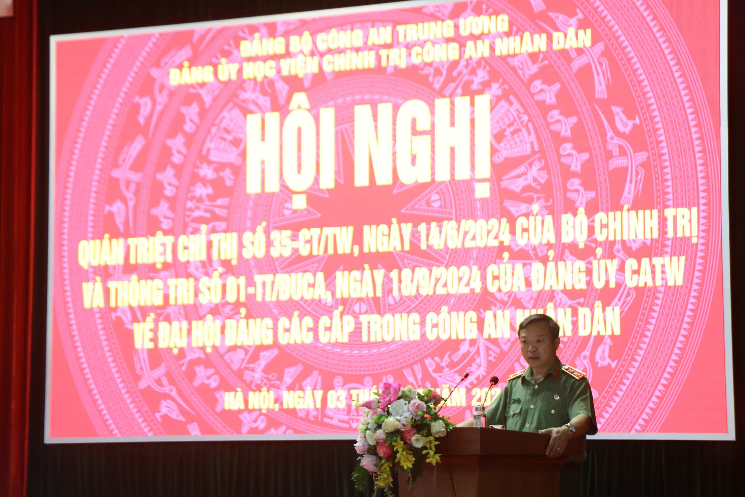 Ngày 03/10/2024, Đảng ủy Học viện Chính trị CAND tổ chức Hội nghị học tập, phổ biến, quán triệt, triển khai thực hiện Chỉ thị số 35-CT/TW, ngày 14/6/2024 của Bộ Chính trị; Thông tri số 01-TT/ĐUCA, ngày 18/9/2024 của Đảng ủy CATW về Đại hội Đảng các cấp trong CAND; kết quả Hội nghị lần thứ 9, thứ 10 Ban Chấp hành Trung ương khóa XIII và Kết luận số 91-KL/TW, ngày 12/8/2024 của Bộ Chính trị về tiếp tục đổi mới căn bản, toàn diện giáo dục và đào tạo trong Đảng bộ Học viện