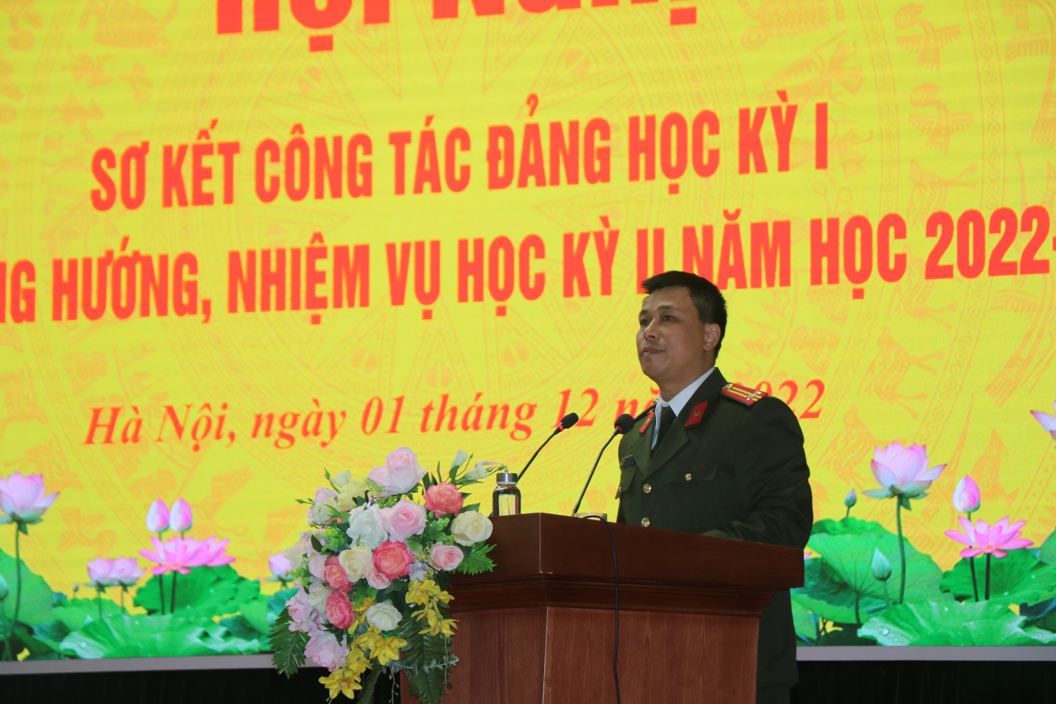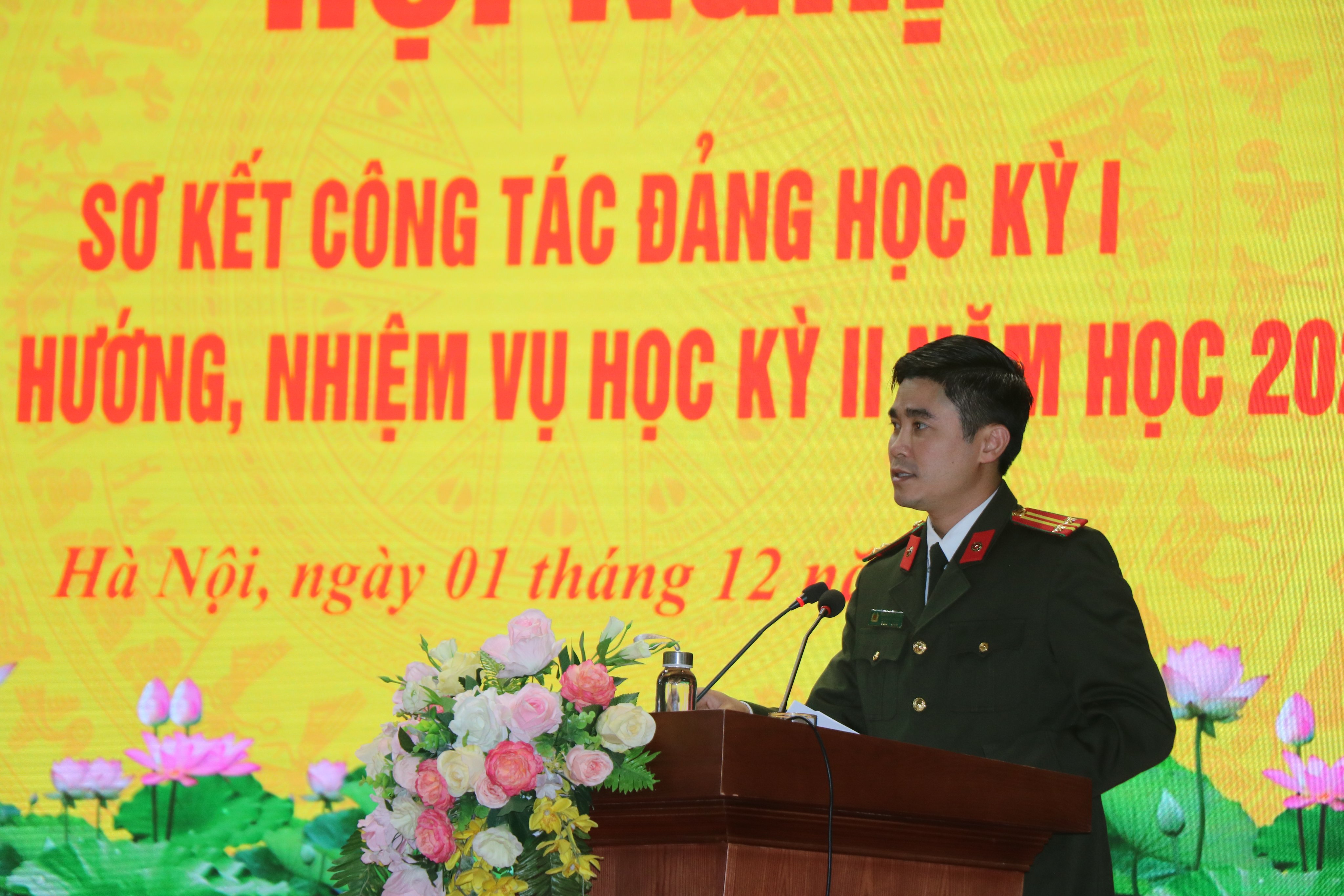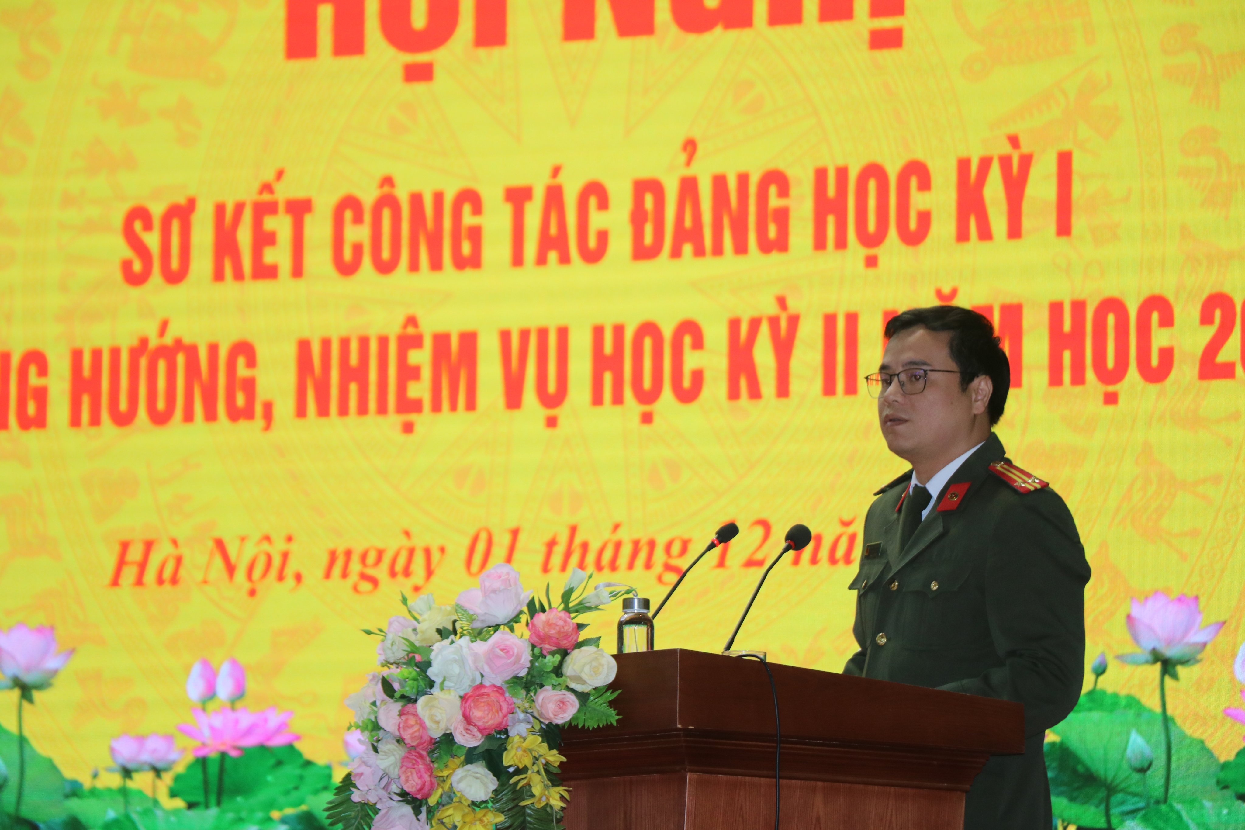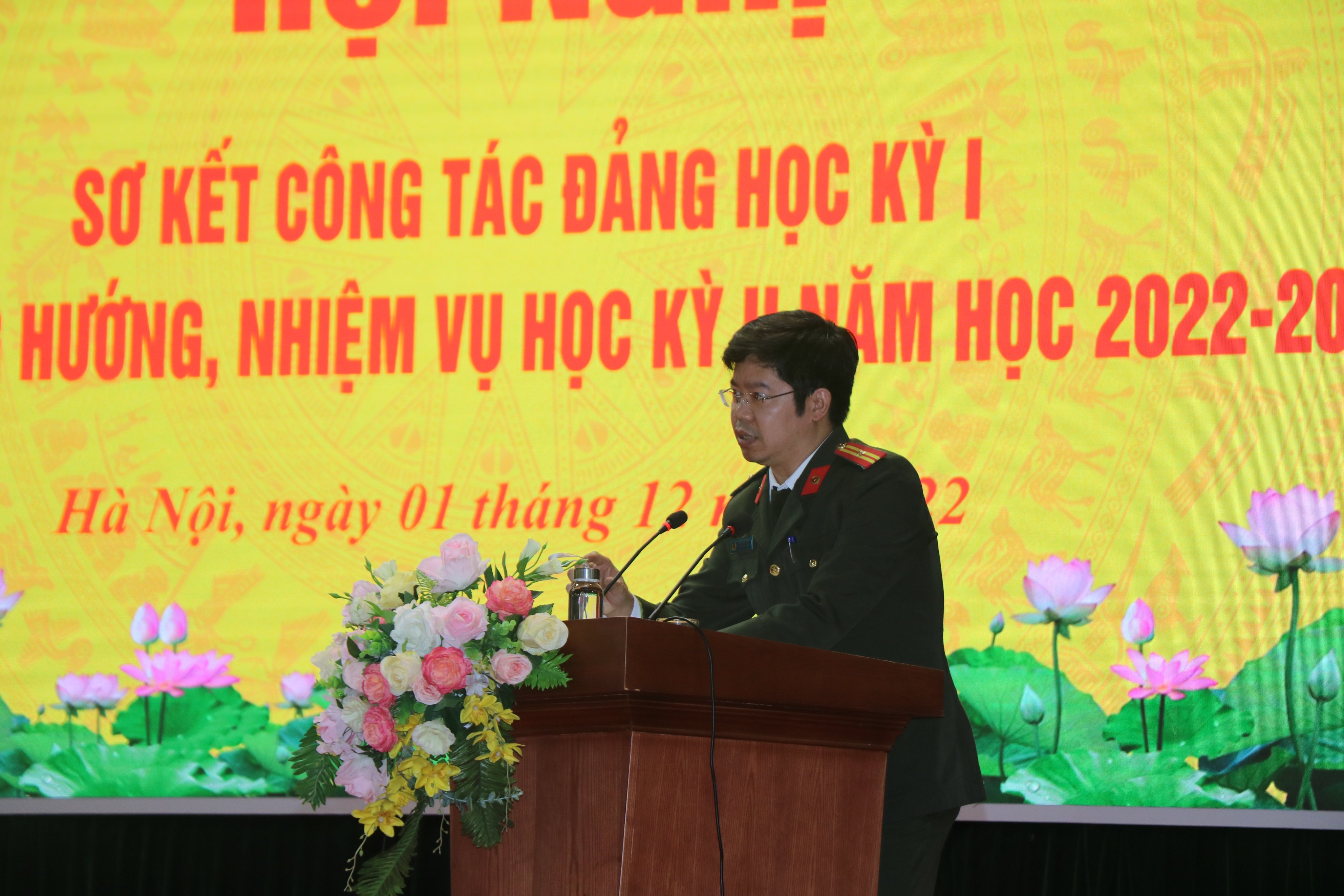 Tại Hội nghị, thay mặt Ban Thường vụ, đồng chí Thiếu tướng, PGS.TS Đinh Ngọc Hoa, Phó Bí thư Đảng ủy, Phó Giám đốc Học viện đã trình bày tóm tắt Báo cáo sơ kết công tác Đảng học kỳ I và phương hướng, nhiệm vụ học kỳ II năm học 2022-2023 của Đảng bộ Học viện. Theo đó, Ban Thường vụ, Đảng ủy Học viện đã luôn đoàn kết, thống nhất, tập trung lãnh đạo, chỉ đạo toàn diện, hiệu quả các mặt công tác của Học viện và đạt được nhiều thành tích đáng ghi nhận trên tất cả các mặt công tác. Ban Thường vụ, Đảng ủy Học viện đã lãnh đạo, chỉ đạo các mặt công tác của Đảng bộ Học viện trên tinh thần dân chủ, khách quan, minh bạch theo đúng cương lĩnh, điều lệ Đảng và quy chế làm việc của Đảng ủy Học viện. Cấp ủy các tổ chức đảng đã làm tốt công tác giáo dục chính trị, tư tưởng cho cán bộ, đảng viên, học viên toàn Học viện khắc phục mọi khó khăn, phấn đấu hoàn thành tốt các nhiệm vụ, chỉ tiêu đề ra trong học kỳ I năm học 2022-2023.
