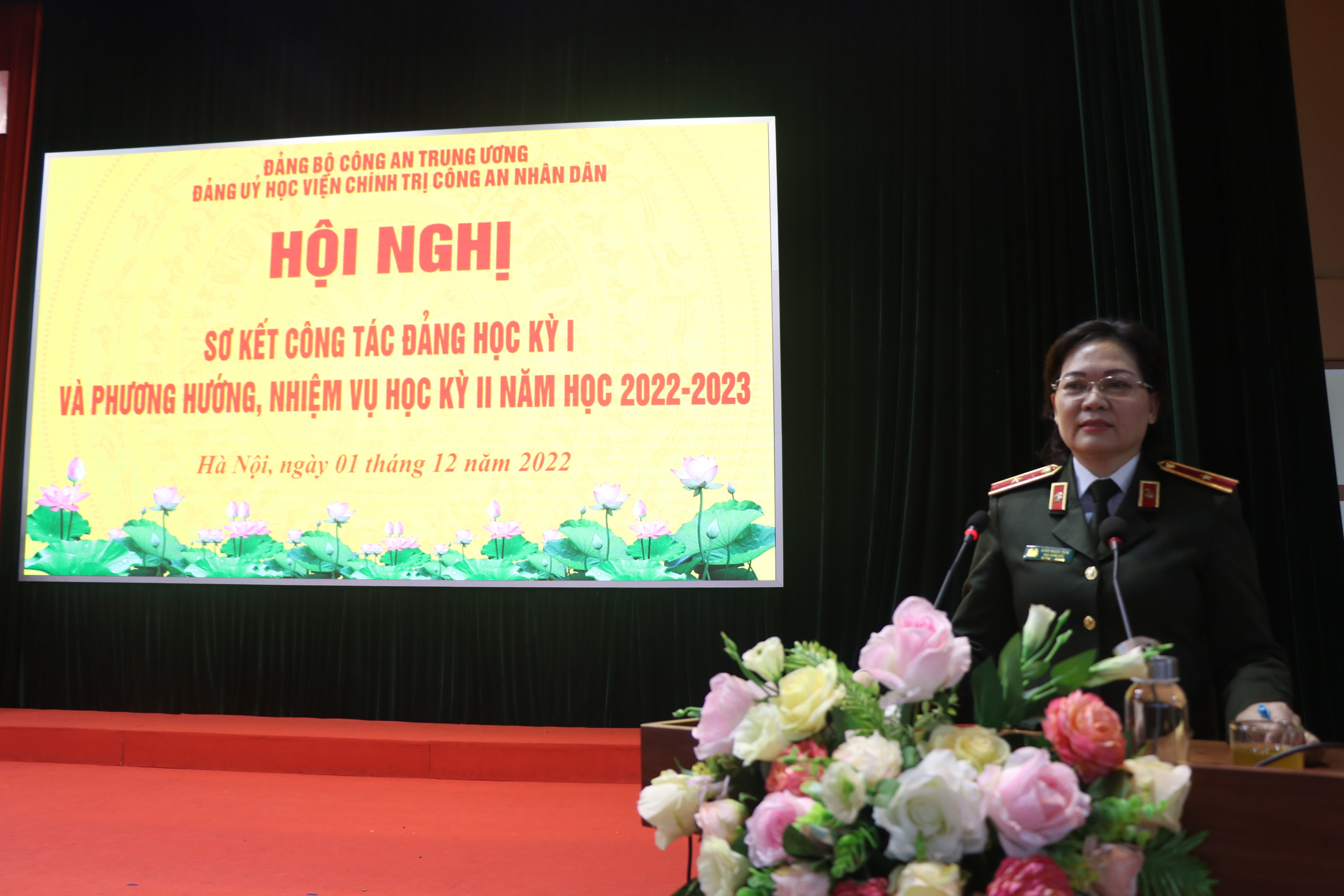 Phát biểu khai mạc Hội nghị, đồng chí Trung tướng, PGS.TS Phan Xuân Tuy, Bí thư Đảng ủy, Giám đốc Học viện đã nhận định: Học kỳ I năm học 2022-2023 diễn ra trong thời gian toàn lực lượng CAND quán triệt, triển khai thực hiện Nghị quyết số 12-CT/TW, ngày 16-3-2022 của Bộ Chính trị khóa XIII về “Đẩy mạnh xây dựng lực lượng CAND thật sự trong sạch, vững mạnh, chính quy, tinh nhuệ, hiện đại đáp ứng yêu cầu, nhiệm vụ trong tình hình mới” (Nghị quyết số 12 của Bộ Chính trị). Đảng bộ Học viện đang chuẩn bị sơ kết giữa nhiệm kỳ Đại hội Đảng bộ lần thứ II, nhiệm kỳ 2020-2025; đề ra những mục tiêu, nhiệm vụ phát triển Học viện trong nửa cuối nhiệm kỳ Đại hội và những năm tiếp theo. Đây là dịp sinh hoạt chính trị sâu rộng trong toàn Đảng bộ Học viện. Đồng thời cũng là dịp để Học viện nhìn lại, đánh giá một cách toàn diện, sâu rộng, thực chất về công tác xây dựng Đảng trong Đảng bộ Học viện và quyết tâm đổi mới toàn diện, căn bản, có đột phá nhằm thực hiện thật tốt Nghị quyết số 12 của Bộ Chính trị và sẵn sàng nhận, hoàn thành xuất sắc mọi nhiệm vụ Đảng ủy CATW, lãnh đạo Bộ Công an giao; đồng thời, hưởng ứng đợt thi đua đặc biệt chào mừng kỷ niệm 10 năm ngày thành lập Học viện, quyết tâm về đích sớm hơn các mục tiêu Học viện đã đề ra đến năm 2025.