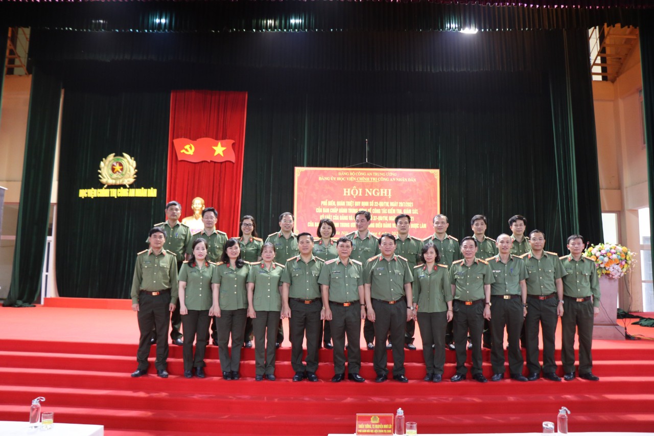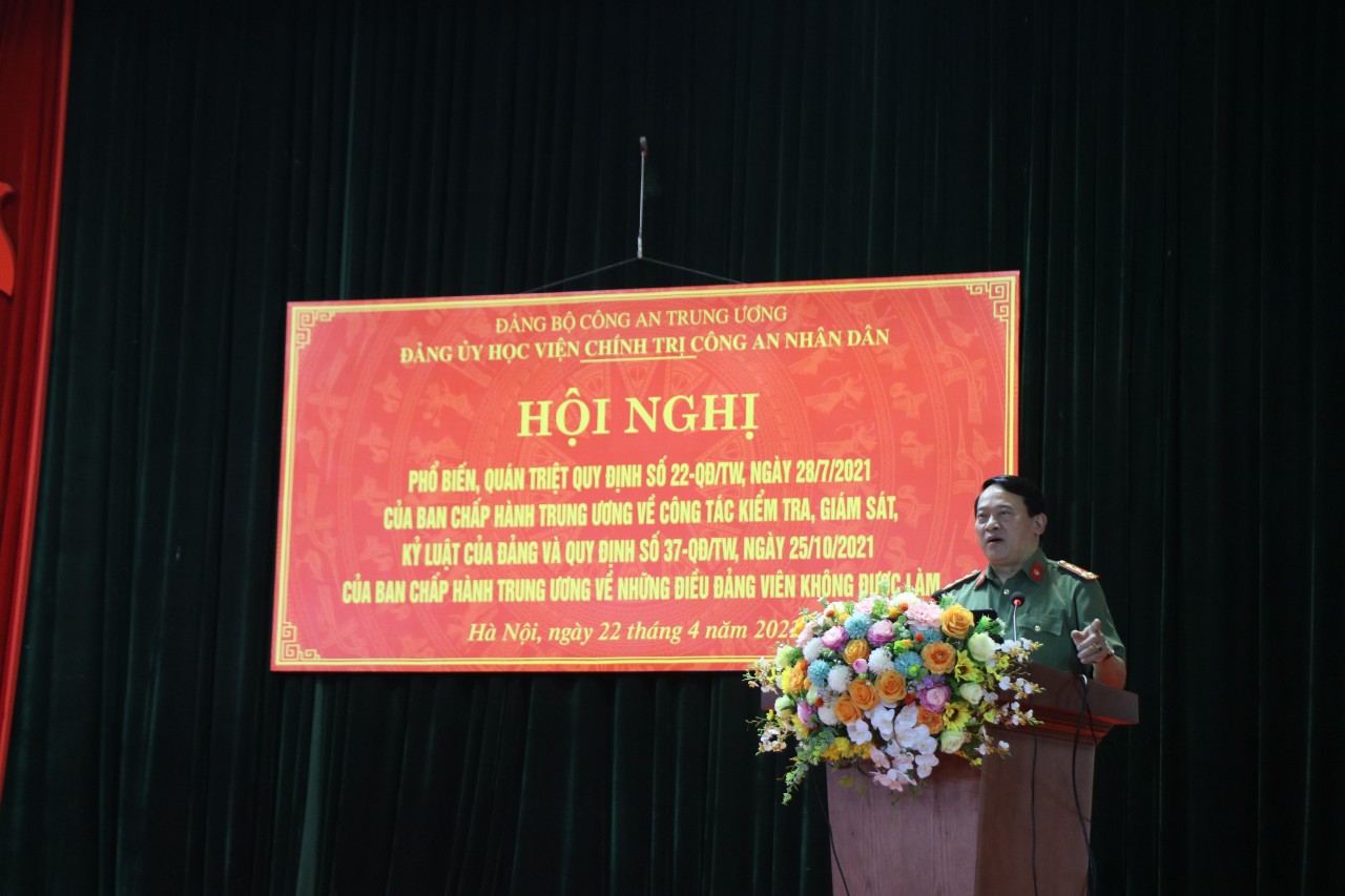 Sáng ngày 22/4/2022, Đảng ủy Học viện Chính trị CAND tổ chức Hội nghị quán triệt, triển khai Quy định số 22-QĐ/TW, ngày 28-7-2021 của Ban Chấp hành Trung ương Đảng, quy định về công tác kiểm tra, giám sát và kỷ luật của Đảng và Quy định số 37-QĐ/TW ngày 25-10-2021 của Ban Chấp hành Trung ương Đảng quy định những điều đảng viên không được làm. Hội nghị quán triệt cho toàn thể cán bộ, đảng viên trong Học viện. Đại tá Tạ Quang Huy, Phó Chủ nhiệm Ủy ban kiểm tra Đảng ủy CATW trực tiếp quán triệt. Đây là hội nghị đã có kế hoạch quán triệt từ thời gian trước, nhưng do ảnh hưởng của dịch bệnh nên đến nay Học viện mới tổ chức thực hiện.