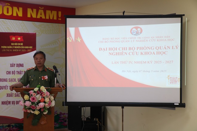Đồng chí Trung tướng, PGS.TS,NGƯT Phan Xuân Tuy, Bí thư Đảng ủy, Giám đốc Học viện dự và phát biểu chỉ đạo tại Đại hội Chi bộ: Phòng Quản lý đào tạo và bồi dưỡng nâng cao; Phòng Quản lý Nghiên cứu khoa học.