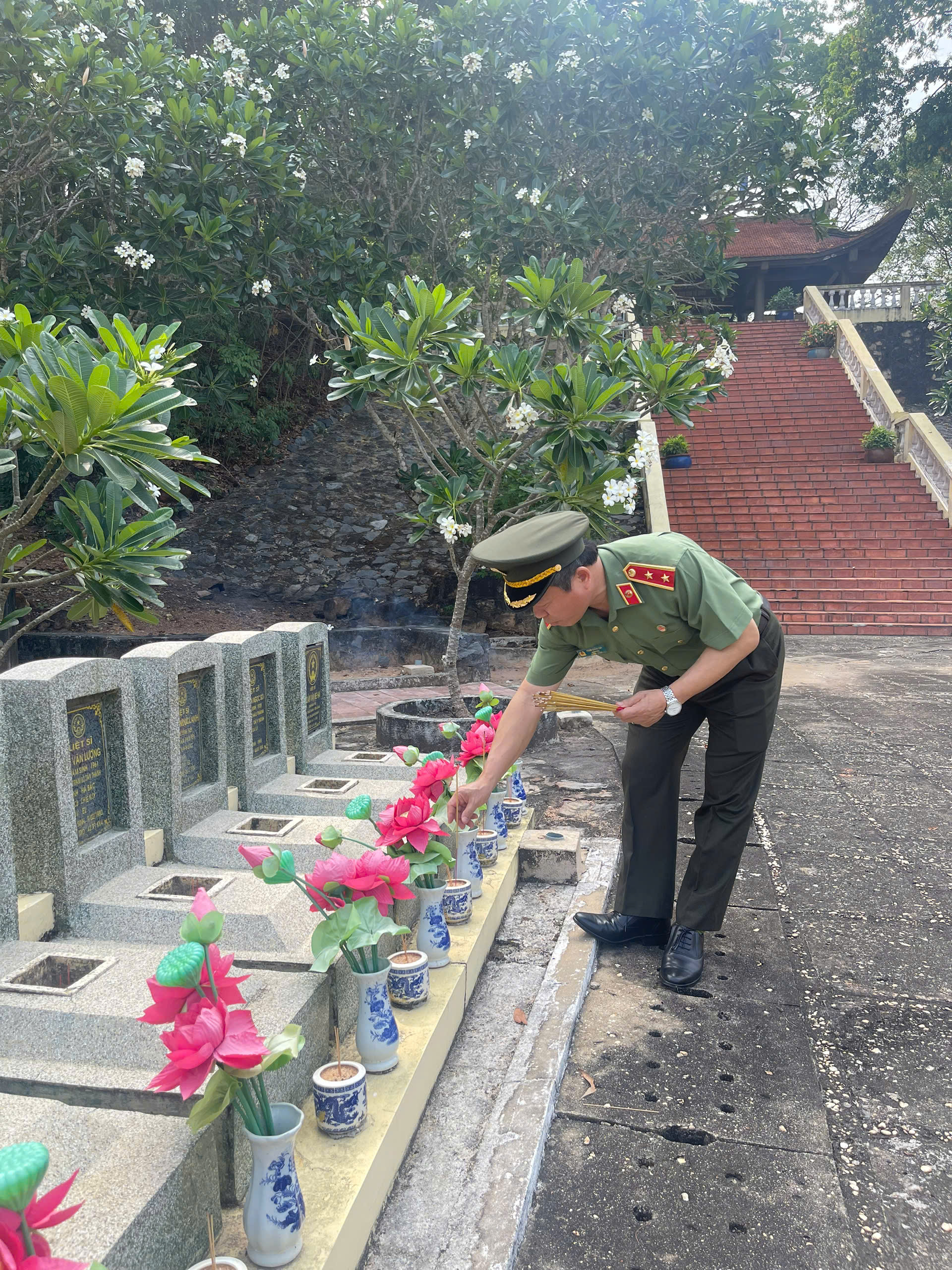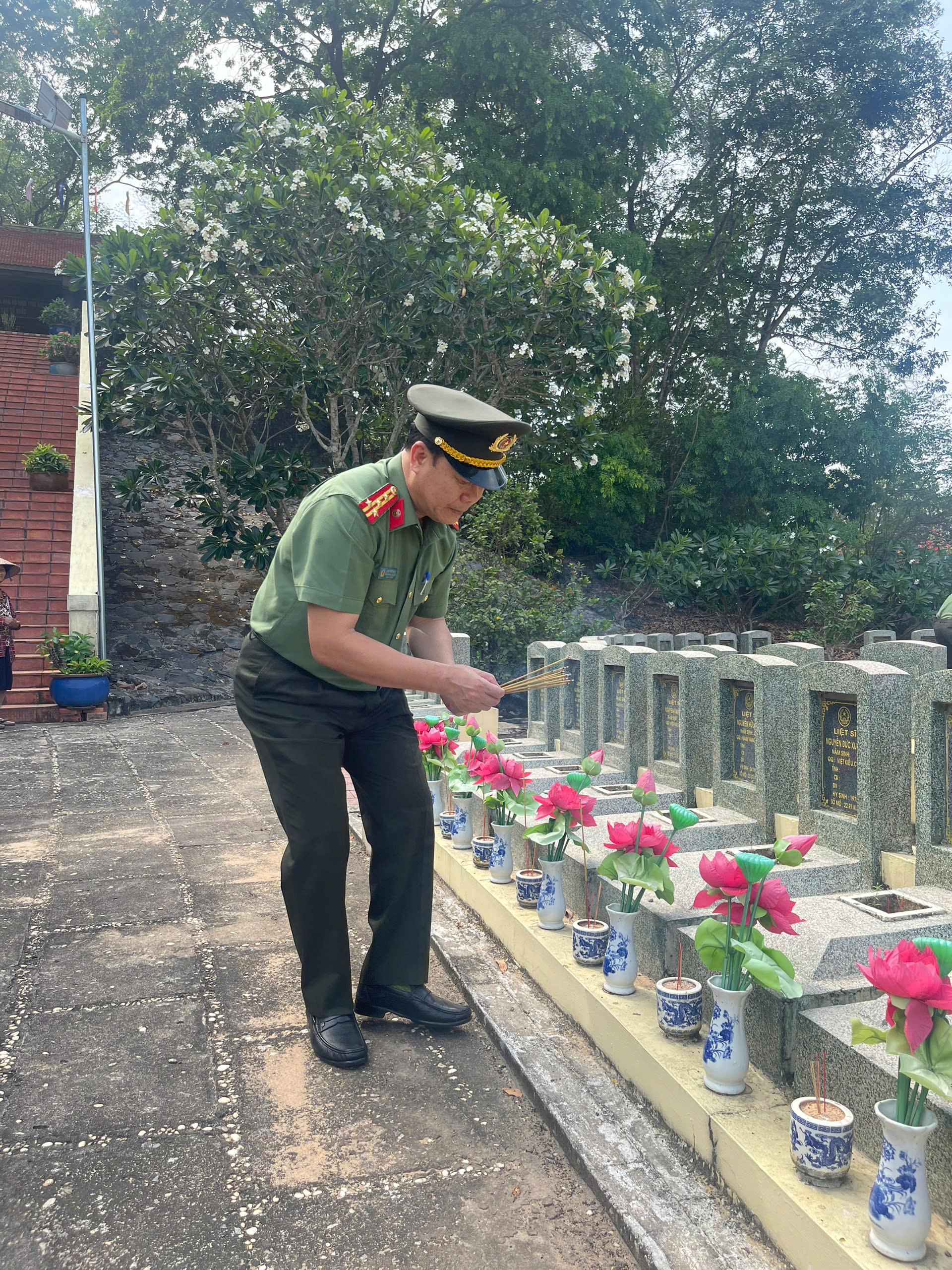 Nhân dịp này, ngày 12/4/2025, Đoàn công tác đã đến dâng hương, dâng hoa tưởng niệm các anh hùng liệt sĩ tại nghĩa trang liệt sĩ Thành phố Hồ Chí Minh; tưởng nhớ anh linh các Mẹ Việt Nam Anh hùng, các anh hùng liệt sĩ - những người con ưu tú của dân tộc đã hy sinh vì độc lập, tự do của Tổ quốc và hạnh phúc của nhân dân, vì sự nghiệp đấu tranh giải phóng dân tộc, xây dựng và bảo vệ Tổ quốc Việt Nam xã hội chủ nghĩa. Trong không khí trang nghiêm và xúc động của buổi lễ, các thành viên Đoàn công tác nguyện tuyệt đối trung thành với mục tiêu lý tưởng của Đảng Cộng sản Việt Nam, mãi mãi đi theo con đường của Đảng, Bác Hồ và nhân dân đã lựa chọn; nguyện tiếp tục không ngừng học tập, rèn luyện, nâng cao trình độ, năng lực, đạo đức cách mạng để đóng góp vào sự nghiệp chung của Đảng, của dân tộc, bảo vệ ANQG, giữ gìn TTATXH, xây dựng lực lượng CAND theo tinh thần Nghị quyết số 12 của Bộ Chính trị; chung sức, đồng lòng, quyết tâm xây dựng quê hương, đất nước bước vào kỷ nguyên mới, kỷ nguyên vươn mình của dân tộc Việt Nam, phát triển giàu mạnh, văn minh, thịnh vượng, vì hạnh phúc và bình yên cho nhân dân.