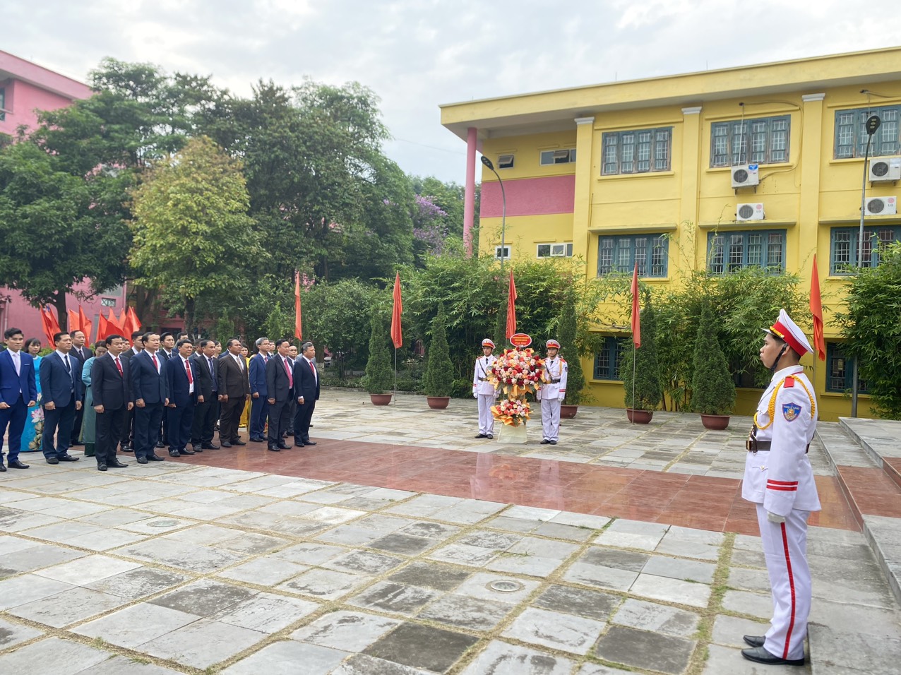 Các đồng chí đại biểu hai Học viện tổ chức dâng hương, dâng hoa tượng đài Chủ tịch Hồ Chí Minh trong khuôn viên Học viện Chính trị CAND Việt Nam