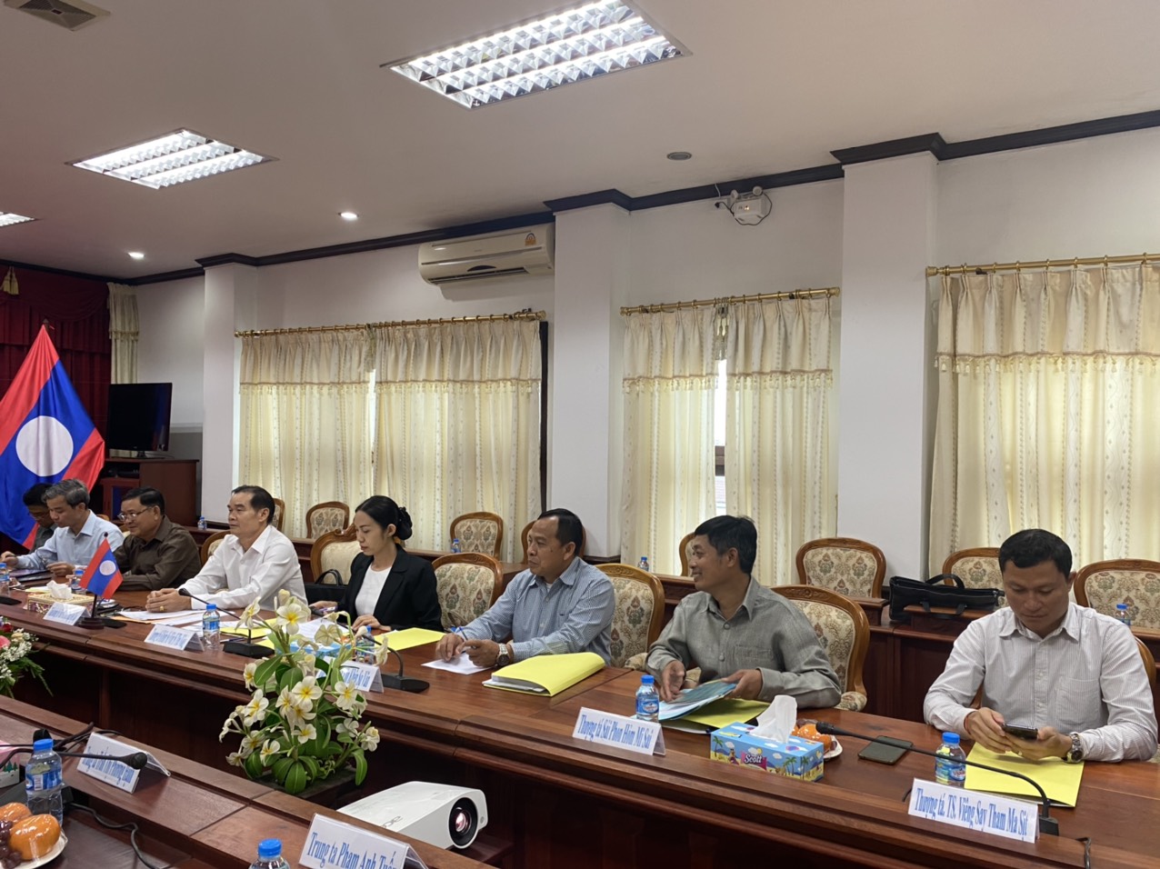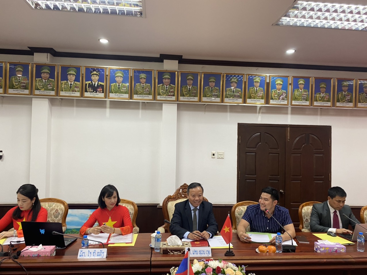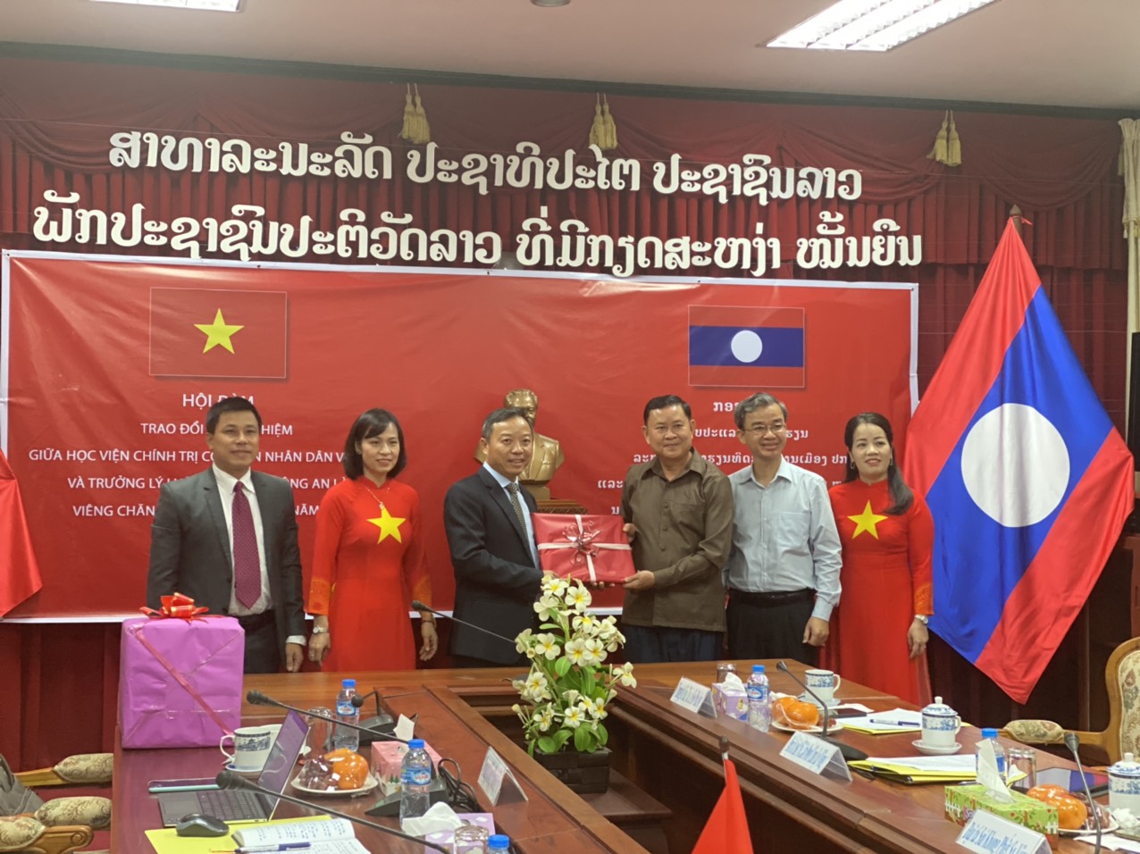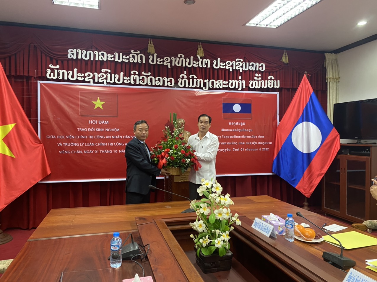 Tiếp Đoàn Công tác, về phía Bộ Công an nước Cộng hòa Dân chủ Nhân dân Lào có đồng chí Thiếu tướng, TS. Xu Va ni Sỉ Xủ Phạp Mi Xay, Phó Tổng Cục trưởng Tổng cục Chính trị; Đại tá Sải Khong Phết Sa Vông, Hiệu trưởng Trường Lý luận Chính trị; Đại tá Khon Sa Văn Khêu Sụ Văn, Phó Cục trưởng Cục Đào tạo; đại diện lãnh đạo Văn phòng Tổng cục Chính trị, Cục Tài chính, Vụ Hợp tác quốc tế và các đơn vị chức năng của Trường Lý luận Chính trị, Bộ Công an Lào.