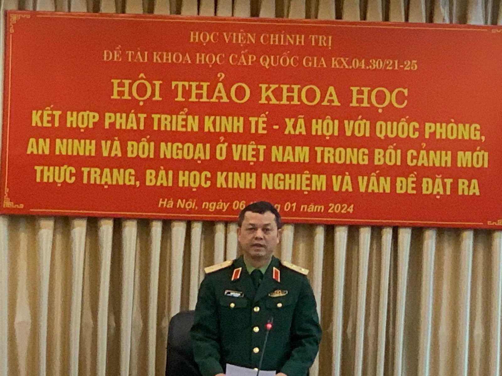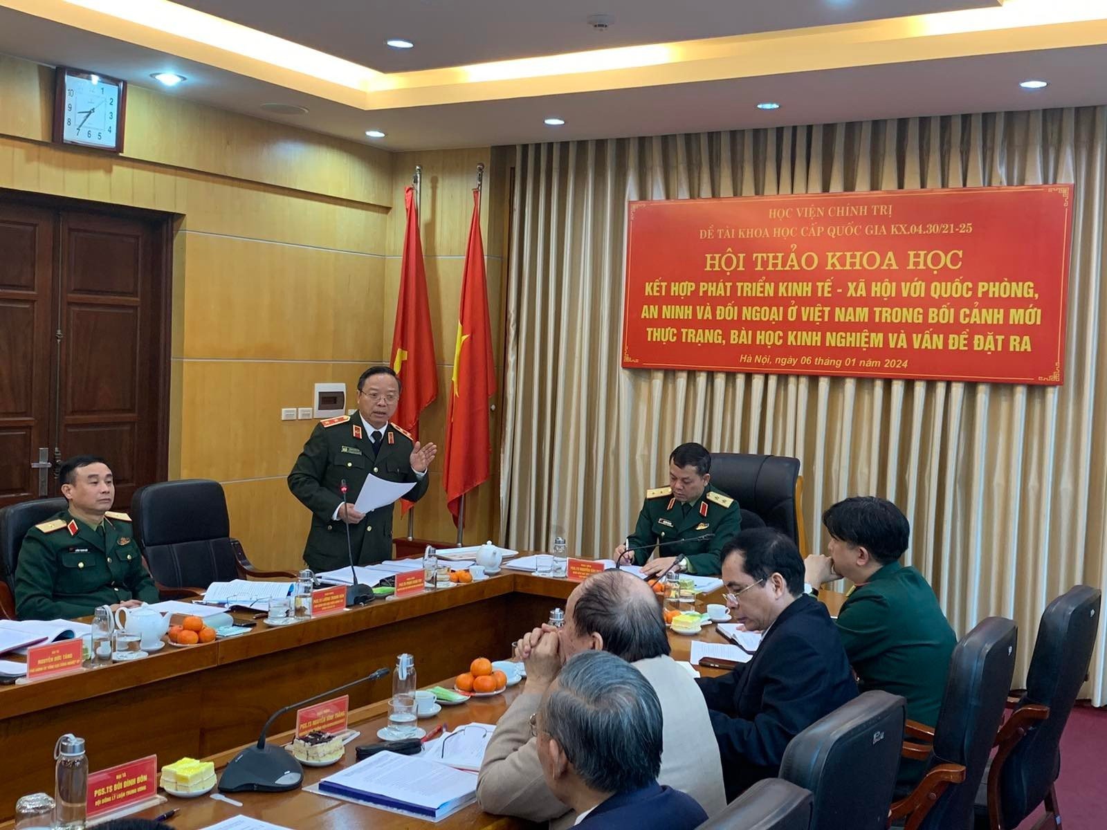 Sáng ngày 06/01/2024, Học viện Chính trị - Bộ Quốc phòng tổ chức Hội thảo khoa học “Kết hợp phát triển kinh tế - xã hội với quốc phòng, an ninh và đối ngoại ở Việt Nam trong bối cảnh mới - Thực trạng, bài học kinh nghiệm và vấn đề đặt ra”. Chủ trì Hội thảo đồng chí Trung tướng, PGS.TS Nguyễn Văn Bạo, Giám đốc Học viện Chính trị, Bộ Quốc phòng, chủ nhiệm đề tài khoa học cấp quốc gia “Kết hợp phát triển kinh tế - xã hội với quốc phòng, an ninh và đối ngoại ở Việt Nam trong bối cảnh mới”, mã số KX.04.30/21-25.