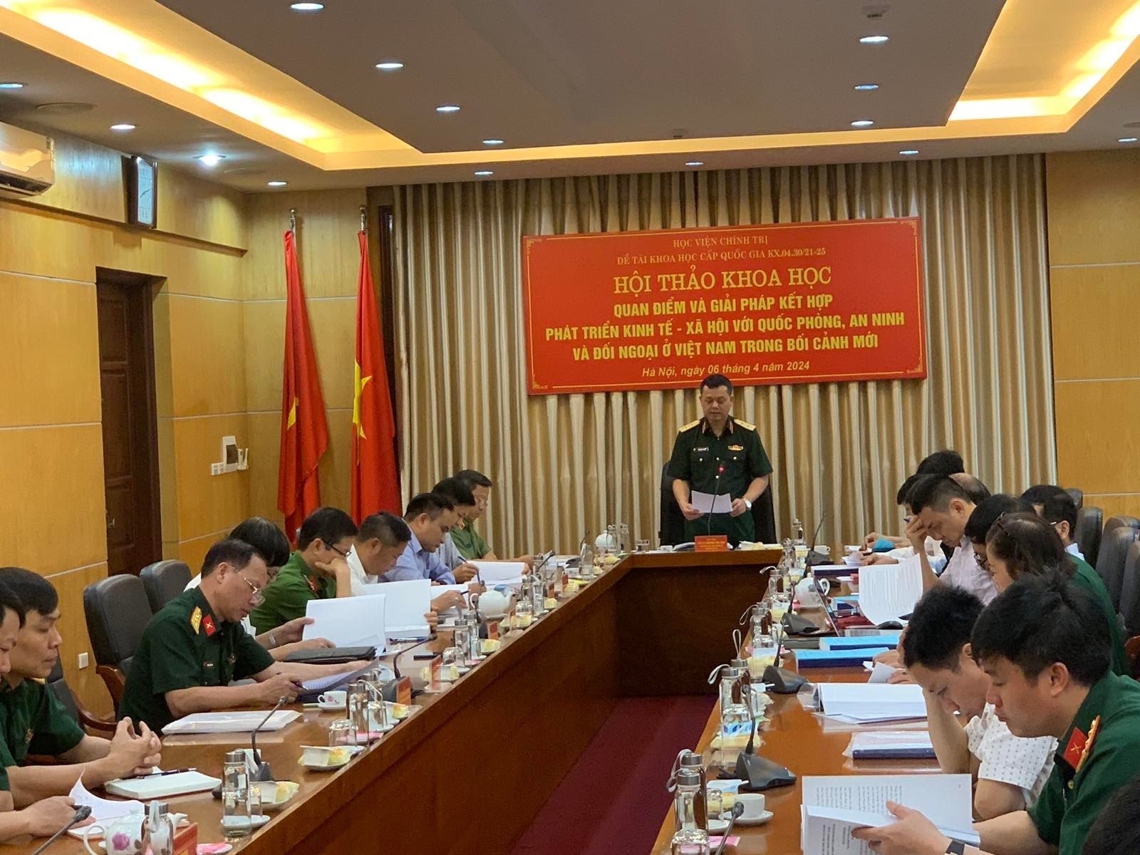 Sáng ngày 06/4/2024, Học viện Chính trị - Bộ Quốc phòng tổ chức Hội thảo khoa học “Quan điểm và giải pháp kết hợp phát triển kinh tế - xã hội với quốc phòng, an ninh và đối ngoại ở Việt Nam trong bối cảnh mới”. Chủ trì Hội thảo đồng chí Trung tướng, PGS.TS Nguyễn Văn Bạo, Giám đốc Học viện Chính trị, Bộ Quốc phòng, chủ nhiệm đề tài khoa học cấp quốc gia “Kết hợp phát triển kinh tế - xã hội với quốc phòng, an ninh và đối ngoại ở Việt Nam trong bối cảnh mới”, mã số KX.04.30/21-25.