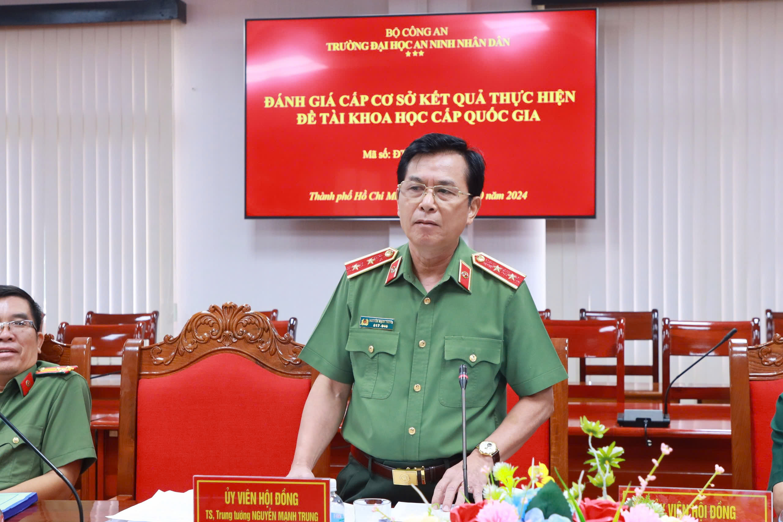 Tại buổi đánh giá, thay mặt Ban Nghiên cứu, PGS.TS, Trung tướng Phan Xuân Tuy, chủ nhiệm đề tài báo cáo tổng quan quá trình đăng ký đề tài, trong đó nhấn mạnh việc đăng ký đề tài là một trong những nhiệm vụ, chỉ tiêu công tác trọng tâm được Đảng bộ Trường Đại học An ninh nhân dân xác định trong Nghị quyết Đại hội Đại biểu Đảng bộ lần thứ XV (nhiệm kỳ 2020 - 2025). Đồng chí chủ nhiệm cũng khái quát quá trình tổ chức các hoạt động nghiên cứu đề tài, nổi bật là khảo sát, trao đổi tình hình thực tế tại các địa phương liên quan đến vấn đề nghiên cứu; tổ chức các hội thảo khoa học; điều tra xã hội học; tham dự các hội ý nghiệp vụ của Bộ Công an; tổ chức hội thảo, lấy ý kiến chuyên gia về báo cáo tổng hợp và các sản phẩm kèm theo của đề tài. Với những hoạt động đó, đến nay, Ban Chủ nhiệm đã hoàn thành đúng tiến độ và số lượng sản phẩm đề tài theo hợp đồng nghiên cứu (55 Chuyên đề khoa học; Báo cáo tổng hợp kết quả nghiên và hệ thống phụ lục đề tài; Báo cáo tóm tắt kết quả nghiên cứu đề tài; Báo cáo kiến nghị; 18 bài báo khoa học của các thành viên nghiên cứu; Bản thảo Sách chuyên khảo; 03 Kỷ yếu hội thảo khoa học; tham gia đào tạo 04 nghiên cứu sinh và 13 học viên cao học). Trên cơ sở kết quả, sản phẩm nghiên cứu, đồng chí chủ nhiệm xin ý kiến đóng góp của các thành viên Hội đồng để chỉnh sửa, bổ sung, nâng chất lượng đề tài, thực hiện các bước nghiên cứu tiếp theo trong thời gian tới.