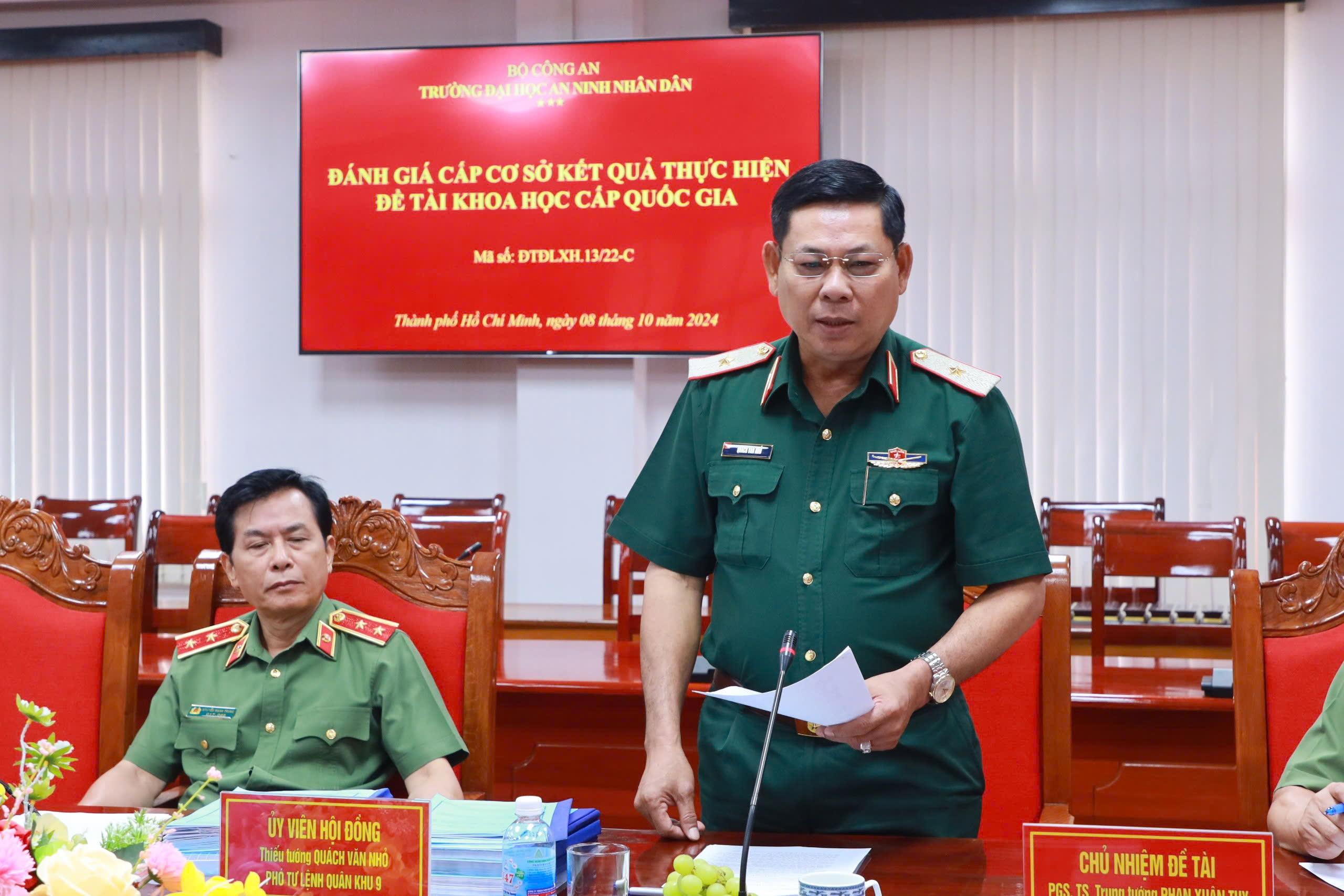 Trên cơ sở báo cáo của chủ nhiệm đề tài, TS, Thiếu tướng Đoàn Minh Lý xin ý kiến đánh giá của các thành viên Hội đồng về góc tiếp cận, bố cục, thông tin, số liệu, nhận xét, đánh giá và hệ thống giải pháp, kiến nghị của báo cáo tổng hợp, hệ thống phụ lục và chất lượng các sản phẩm kèm theo đề tài.