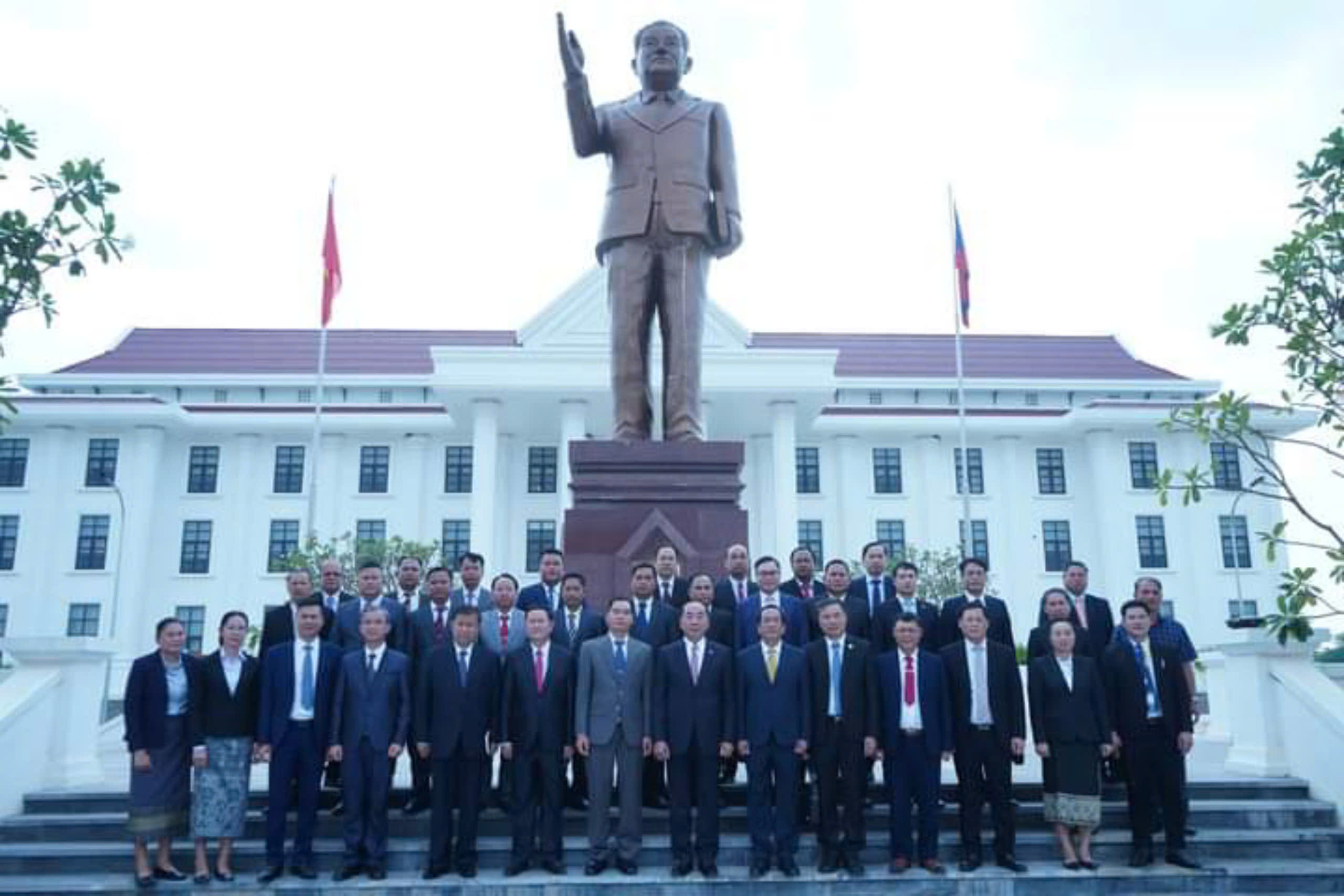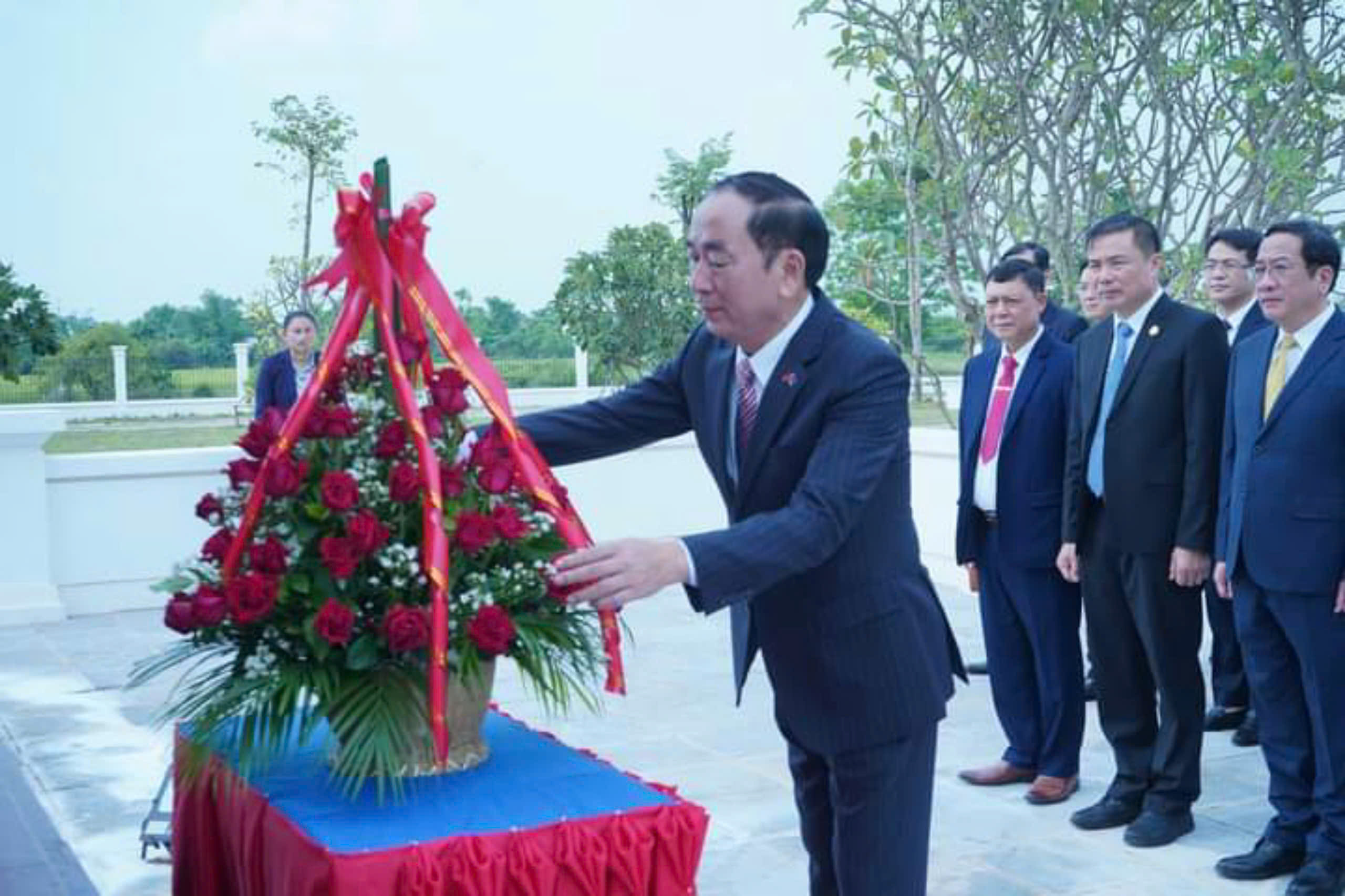 Đồng chí Thứ trưởng Trần Quốc Tỏ cùng đoàn công tác đặt lẵng hoa và chụp ảnh lưu niệm trước Tượng đài Chủ tịch Kaysone Phomvihane tại Học viện Chính trị Công an Lào