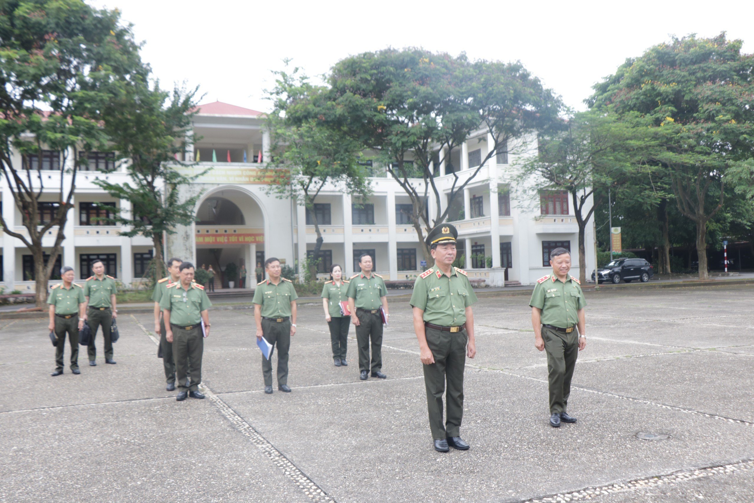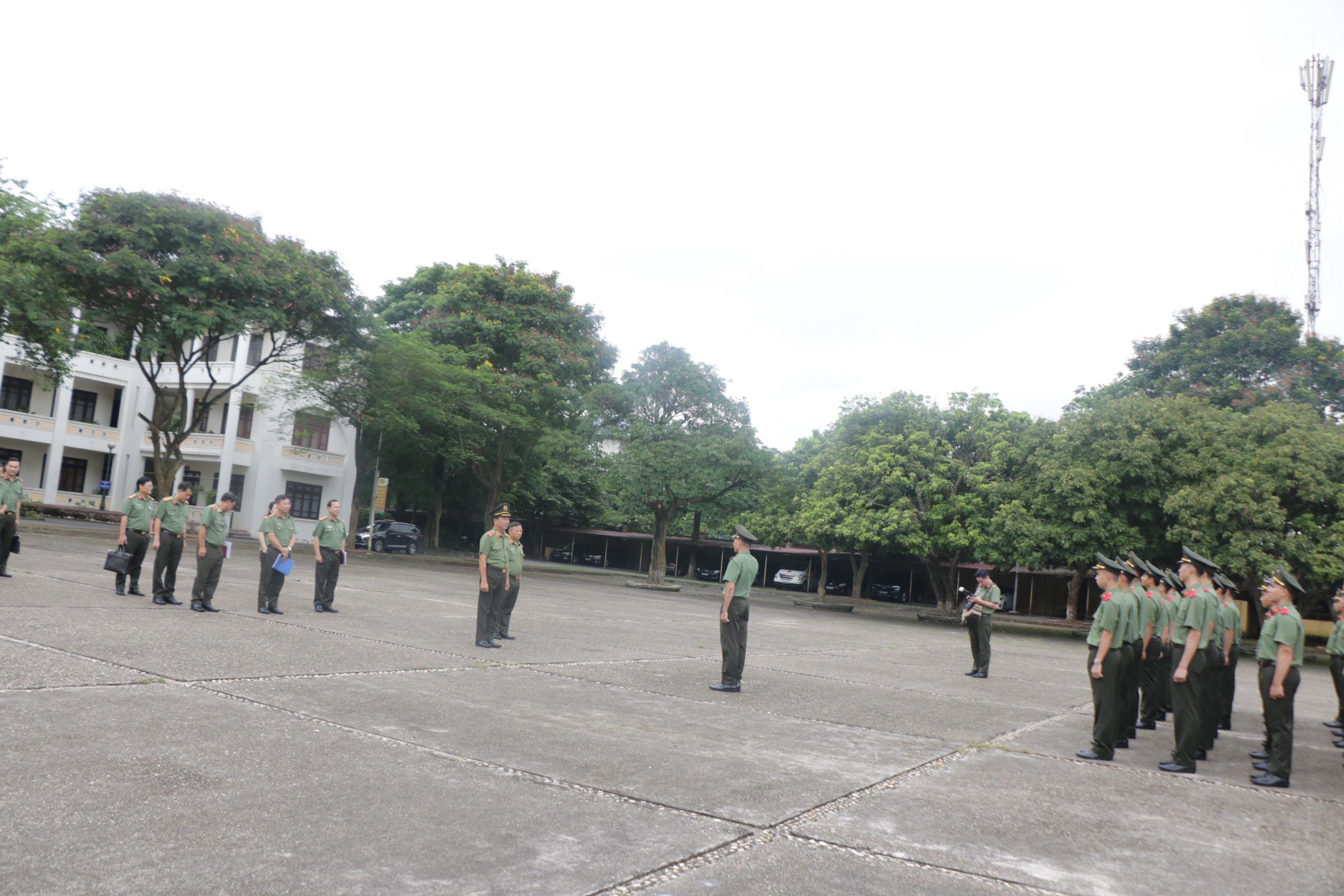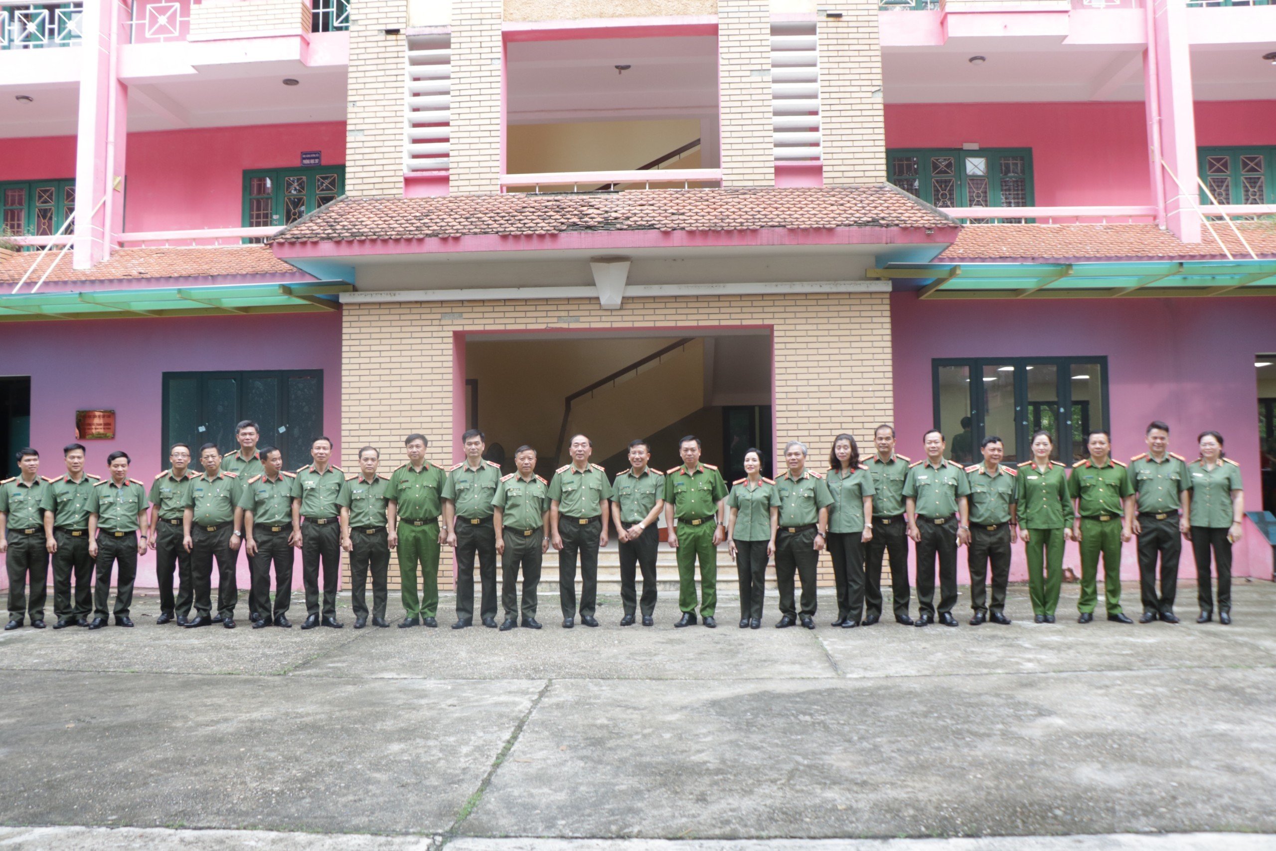 Đồng chí Thứ trưởng cùng các đồng chí đại biểu thăm, động viên học viên khóa D10 của Học viện Chính trị CAND đang tập luyện đầu khóa và chụp ảnh lưu niệm
