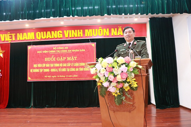 Tại buổi gặp mặt, Đồng chí Giám đốc Học viện biểu dương tinh thần học tập, nghiên cứu của các Học viên Lớp đào tạo trình độ cao cấp lý luận chính trị, hệ không tập trung khóa 6, đồng thời khẳng định: đào tạo lý trình độ cao cấp lý luận chính trị là một trong những nhiệm vụ trọng tâm của Học viện. Ban Giám đốc Học viện luôn quan tâm và tạo mọi điều kiện tốt nhất để đảm bảo điều kiện cho các học viên nghiên cứu, rèn luyện và hoàn thành các yêu cầu đặt ra đối với khóa học theo quy định. Đồng chí Giám đốc Học viện đề nghị các học viên tiếp tục nêu cao tinh thần tự giác, trách nhiệm, nghiêm túc, chấp hành tốt điều lệnh Công an nhân dân, nội quy lớp học, hoàn thành khóa học theo đúng thời gian quy định.