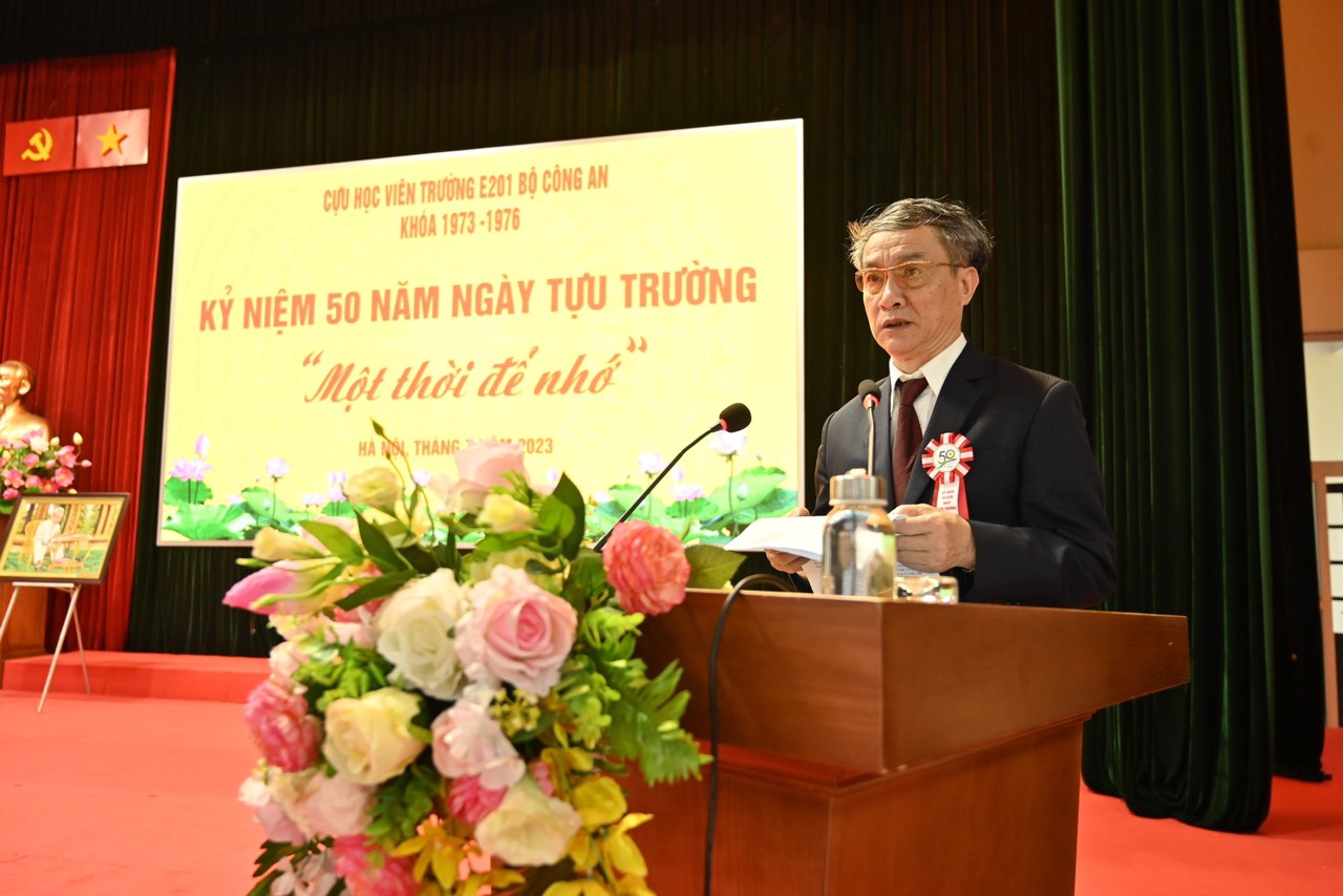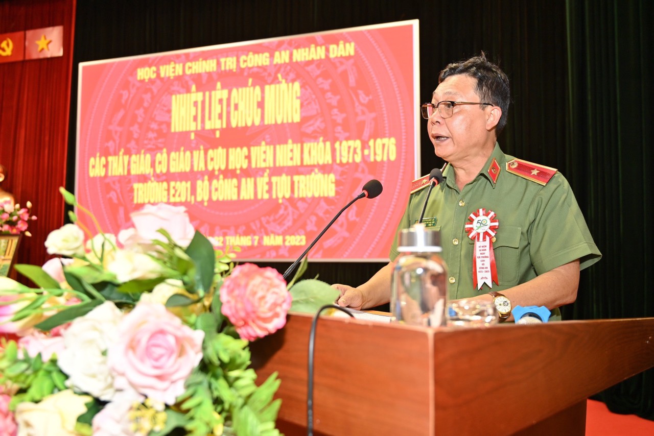 Tại buổi gặp mặt, đồng chí Đại tá Nguyễn Đức Nhuần thay mặt các đồng chí là học viên trường E201 phát biểu gửi lời cảm ơn chân thành đến Đảng ủy, Ban Thường vụ Đảng uỷ, Ban Giám đốc Học viện Chính trị CAND đã tận tình giúp đỡ, tạo mọi điều kiện thuận lợi nhất để tổ chức buổi gặp mặt trang trọng, ý nghĩa này; đồng chí cũng cảm ơn các thầy giáo, cô giáo và các đồng chí cựu học viên đã sắp xếp thời gian, công việc để tham dự buổi lễ gặp mặt kỷ niệm 50 năm ngày tựu trường.