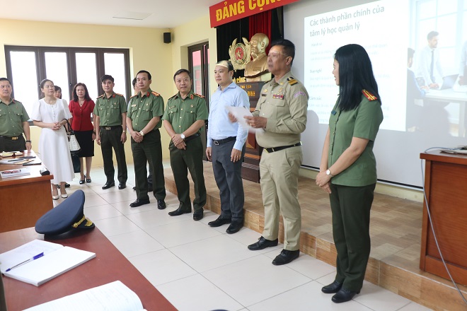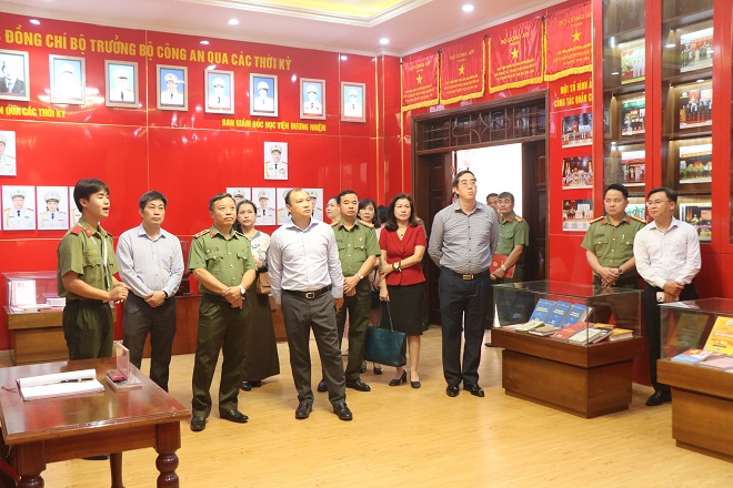 Các đồng chí đại biểu dâng hương tượng đài Chủ tịch Hồ Chí Minh; tham quan Phòng truyền thống, Trung tâm chỉ huy; thăm, gặp gỡ học viên lớp Bồi dưỡng quản trị nhân lực cho cán bộ cấp cao Bộ Nội vụ Camphuchia đang học tập tại Học viện Chính trị CAND