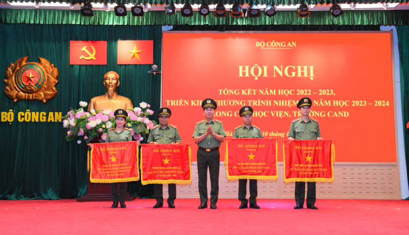 Thứ trưởng Trần Quốc Tỏ trao Cờ thi đua của Bộ Công an tặng Học viện Chính trị CAND và các đơn vị có thành tích tiêu biểu trong năm học 2022-2023.