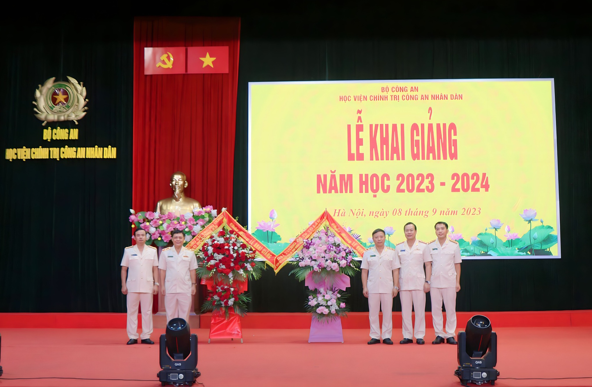Ban Giám đốc Học viện Chính trị CAND đón nhận lẵng hoa tươi thắm của Đảng ủy Công an Trung ương và đồng chí Đại tướng, GS.TS Tô Lâm, Bộ trưởng Bộ Công an