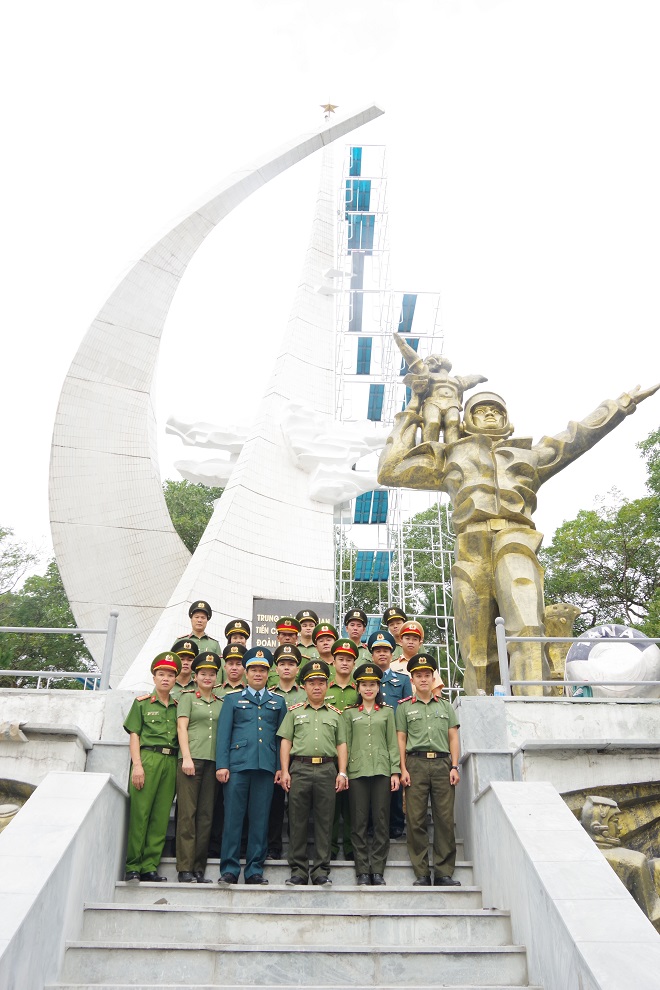 Đồng chí Trung tướng, PGS.TS Phan Xuân Tuy, Bí thư Đảng ủy, Giám đốc Học viện Chính trị CAND cùng đoàn công tác chụp ảnh ưu niệm tại Tượng đài không quân.