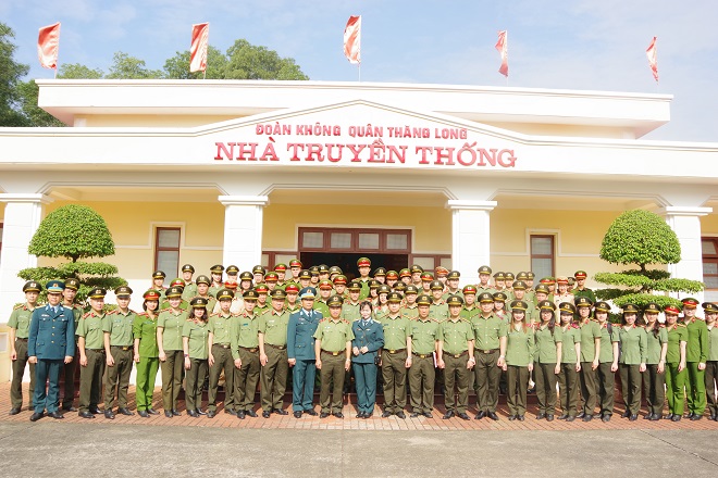 Đồng chí Trung tướng, PGS.TS Phan Xuân Tuy, Bí thư Đảng ủy, Giám đốc Học viện Chính trị CAND cùng đoàn công tác chụp ảnh lưu niệm Nhà truyền thống Sư đoàn Không quân 371