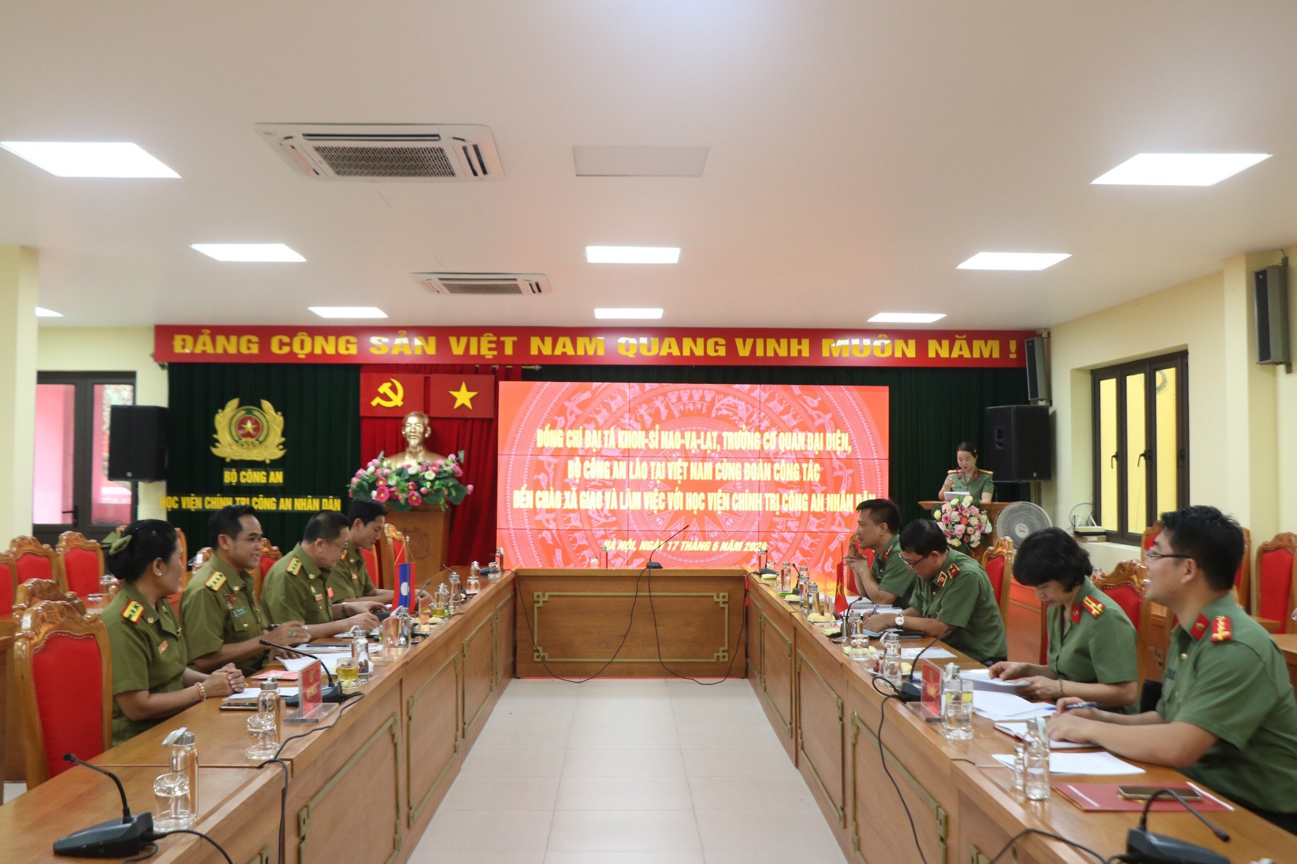Được sự đồng ý của lãnh đạo Bộ Công an Việt Nam, sáng ngày 17/6/2024, Học viện Chính trị CAND đã tiếp xã giao và làm việc với Đoàn Cơ quan đại diện Bộ Công an Lào tại Việt Nam do đồng chí Đại tá Khon-sỉ Nao-vạ-lạt, Trưởng Cơ quan đại diện làm Trưởng đoàn. Đồng chí Thiếu tướng, TS Nguyễn Như Lôi, Phó Bí thư Đảng ủy, Phó Giám đốc Học viện dự và chủ trì buổi tiếp.