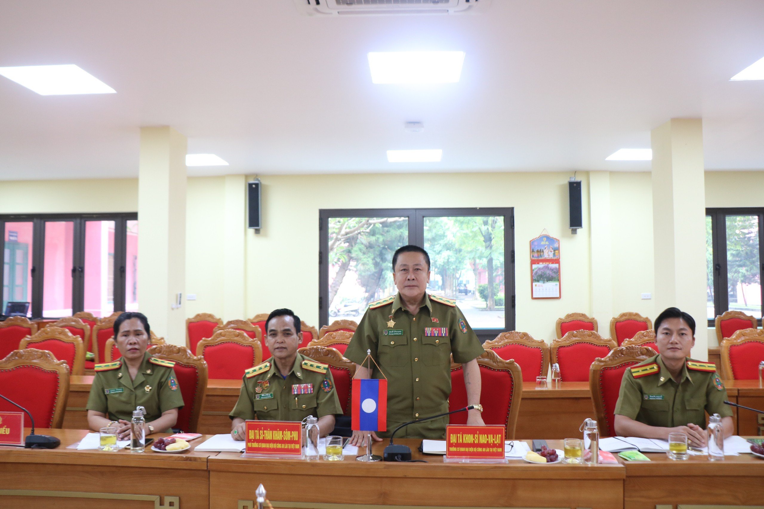 Đồng chí Đại tá Khon-sỉ Nao-vạ-lạt, Trưởng Cơ quan đại diện làm Trưởng đoàn phát biểu tại buổi làm việc