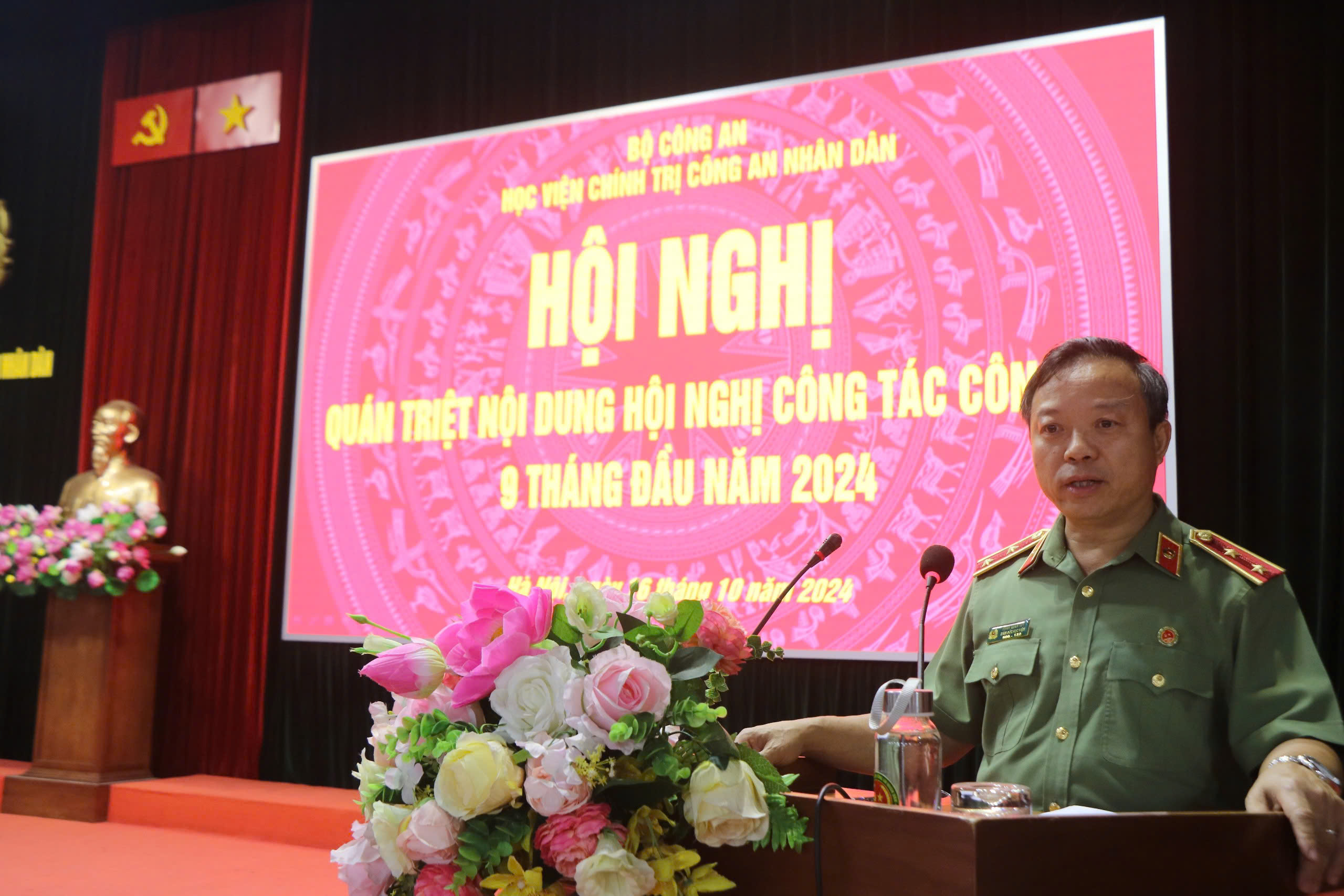 Tiếp đó, Học viện tổ chức Hội nghị quán triệt nội dung Hội nghị công tác Công an 9 tháng đầu năm 2024. Tại Hội nghị, đồng chí PGS.TS, Trung tướng Phan Xuân Tuy, Bí thư Đảng ủy, Giám đốc Học viện Chính trị CAND đã quán triệt kết quả các Hội nghị sơ kết công tác Công an 09 tháng đầu năm năm 2024; sơ kết 02 năm thực hiện Nghị quyết số 12 của Đảng ủy CATW và chỉ thị số 11 của Bộ trưởng Bộ Công an.