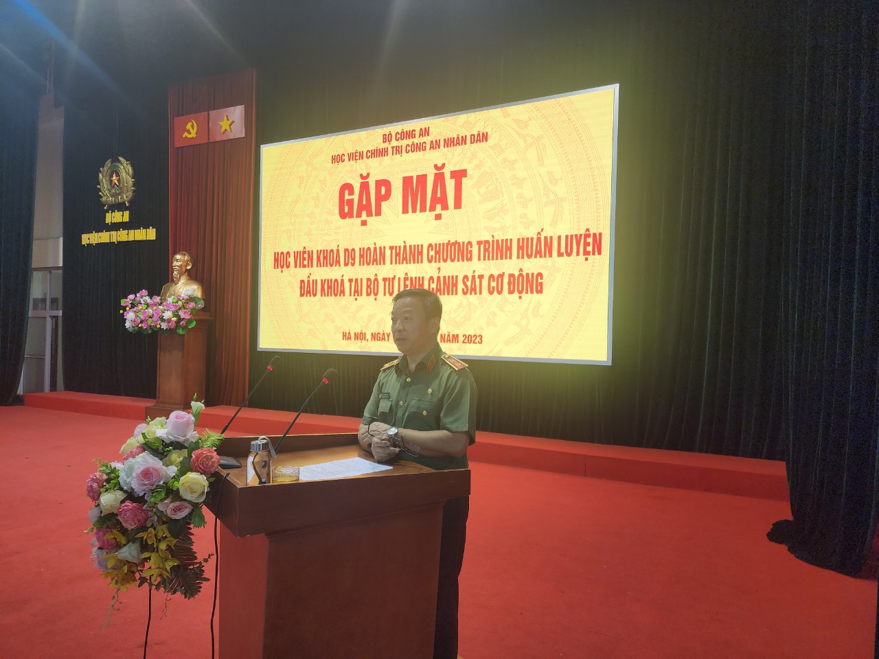 Để động viên và nắm bắt tâm tư, nguyện vọng của học viên khoá D9, góp phần nâng cao hiệu quả công tác đào tạo, quản lý, giáo dục học viên; ngày 07/4/2023, tại Hội trường trung tâm, Học viện Chính trị CAND tổ chức gặp mặt, quán triệt đối với học viên khóa D9 hoàn thành chương trình huấn luyện đầu khóa học tại Trung tâm Huấn luyện và bồi dưỡng nghiệp vụ 1, Bộ Tư lệnh Cảnh sát cơ động (K02) trở về Học viện học tập, rèn luyện. Đồng chí Trung tướng, PGS. TS Phan Xuân Tuy, Bí thư Đảng ủy, Giám đốc Học viện dự và phát biểu chỉ đạo; tham dự buổi gặp mặt có đồng chí Thượng tá, TS Nguyễn Văn Tuấn, Phó Giám đốc Học viện; các đồng chí đại diện lãnh đạo Phòng Chính trị; lãnh đạo, cán bộ Phòng Quản lý học viên và toàn thể học viên khóa D9.