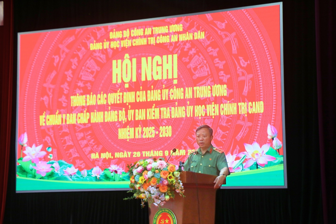 Sáng ngày 26/9/2025 Đảng ủy Học viện Chính trị Công an nhân dân trang trọng tổ chức Hội nghị Công bố các quyết định của Ban thường vụ Đảng ủy Công an Trung ương chuẩn y Ban chấp hành Đảng bộ và Ủy ban Kiểm tra Đảng ủy Học viện nhiệm kỳ 2025 – 2030. Đồng thời, tổ chức Hội nghị quán triệt các Nghị quyết Trung ương.
