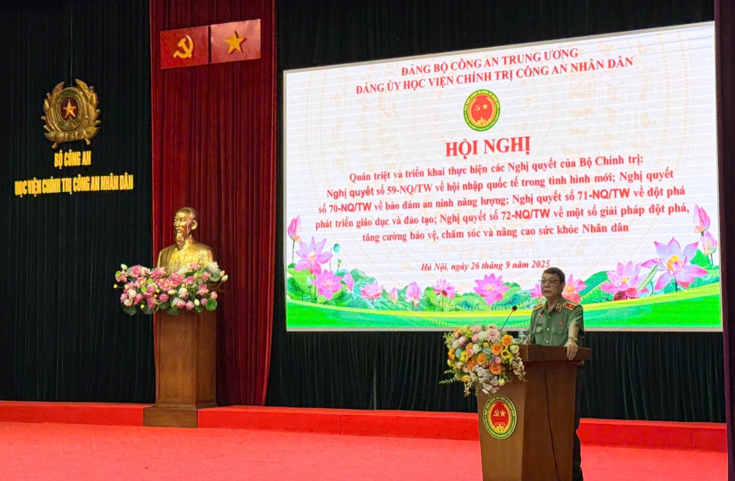 Để kịp thời phổ biến, quán triệt các nghị quyết của Trung ương tới toàn thể cán bộ, đảng viên Học viện, tại Hội nghị, đồng chí TS. Thiếu tướng Nguyễn Như Lôi – Phó Bí thư Đảng ủy, Phó Giám đốc Học viện đã thay mặt Đảng ủy Ban Giám đốc học viện quán triệt tới toàn thể lãnh đạo, cán bộ, đảng viên nội dung các nghị quyết; đồng chí Phó Giám đốc Học viện nhấn mạnh ý nghĩa quan trọng của các nghị quyết mới được Bộ Chính trị, Ban Bí thư ban hành về hội nhập quốc tế, bảo đảm an ninh năng lượng, phát triển giáo dục – đào tạo và văn hóa. Đồng chí yêu cầu cán bộ, đảng viên, giảng viên và học viên Học viện nghiêm túc học tập, quán triệt, gắn với nhiệm vụ đào tạo, nghiên cứu, bồi dưỡng cán bộ chính trị CAND; cụ thể hóa nghị quyết bằng kế hoạch, chương trình hành động thiết thực, hiệu quả, góp phần xây dựng Đảng bộ trong sạch, vững mạnh và hoàn thành tốt nhiệm vụ được giao.