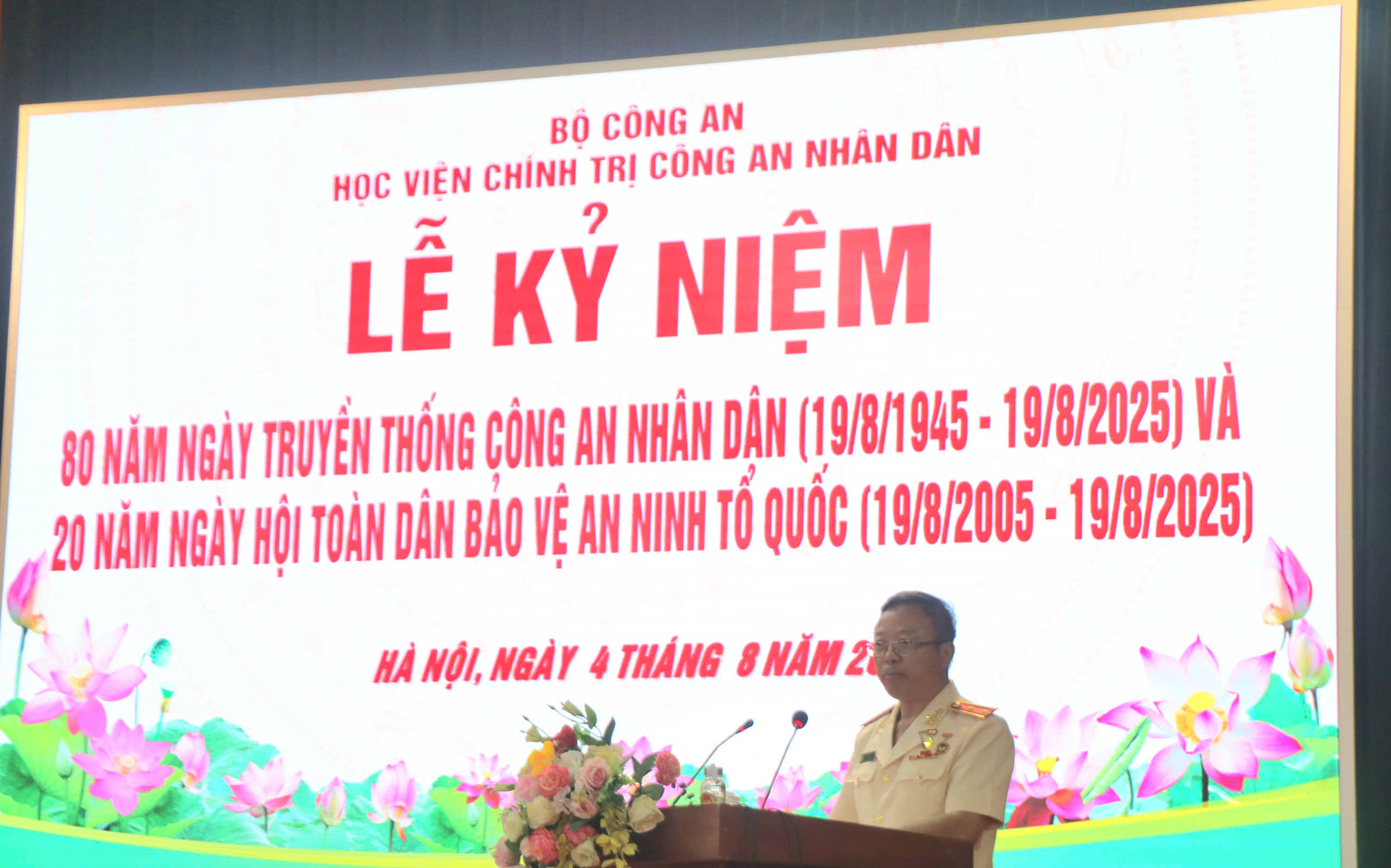 Trong không khí phấn khởi, tự hào của những ngày tháng tám lịch sử, nhân kỷ niệm 80 năm Ngày truyền thống Công an nhân dân (19/8/1945 – 19/8/2025), 20 năm Ngày hội toàn dân bảo vệ an ninh Tổ quốc (19/8/2005 – 19/8/2025); sáng ngày 4/8/2025, Học viện Chính trị CAND tổ chức Hội nghị gặp mặt đầu năm học 2025 – 2026 và phổ biến, quán triệt một số nội dung, chương trình công tác bao gồm: Kỷ niệm 80 năm Ngày truyền thống CAND (19/8/1945 – 19/8/2025), 20 năm Ngày hội toàn dân bảo vệ an ninh Tổ quốc (19/8/2005 – 19/8/2025); thông báo quyết định nâng lương của đồng chí Trung tướng Phan Xuân Tuy, Bí thư Đảng uỷ, Giám đốc Học viện đồng thời phổ biến, quán triệt các nội dung cơ bản của Nghị quyết Hội nghị Trung ương 12, Khoá XIII; kết luận chỉ đạo của lãnh đạo Bộ Công an về tình hình, kết quả công tác Công an 6 tháng đầu năm 2025 và một số nhiệm vụ trọng tâm của Học viện trong thời gian tới. Đồng chí PGS.TS, NGƯT, Trung tướng Phan Xuân Tuy, Bí thư Đảng ủy, Giám đốc Học viện chủ trì Hội nghị. Tham dự có Đồng chí TS, Đại tá Tống Văn Khuông, Ủy viên Ban Thường vụ Đảng ủy, Phó Giám đốc Học viện; đồng chí TS, Đại tá Nguyễn Văn Tuấn, Ủy viên Ban Thường vụ, Phó Giám đốc Học viện; các đồng chí chuyên gia cao cấp Học viện cùng toàn thể cán bộ, giảng viên, nhân viên và học viên Học viện.