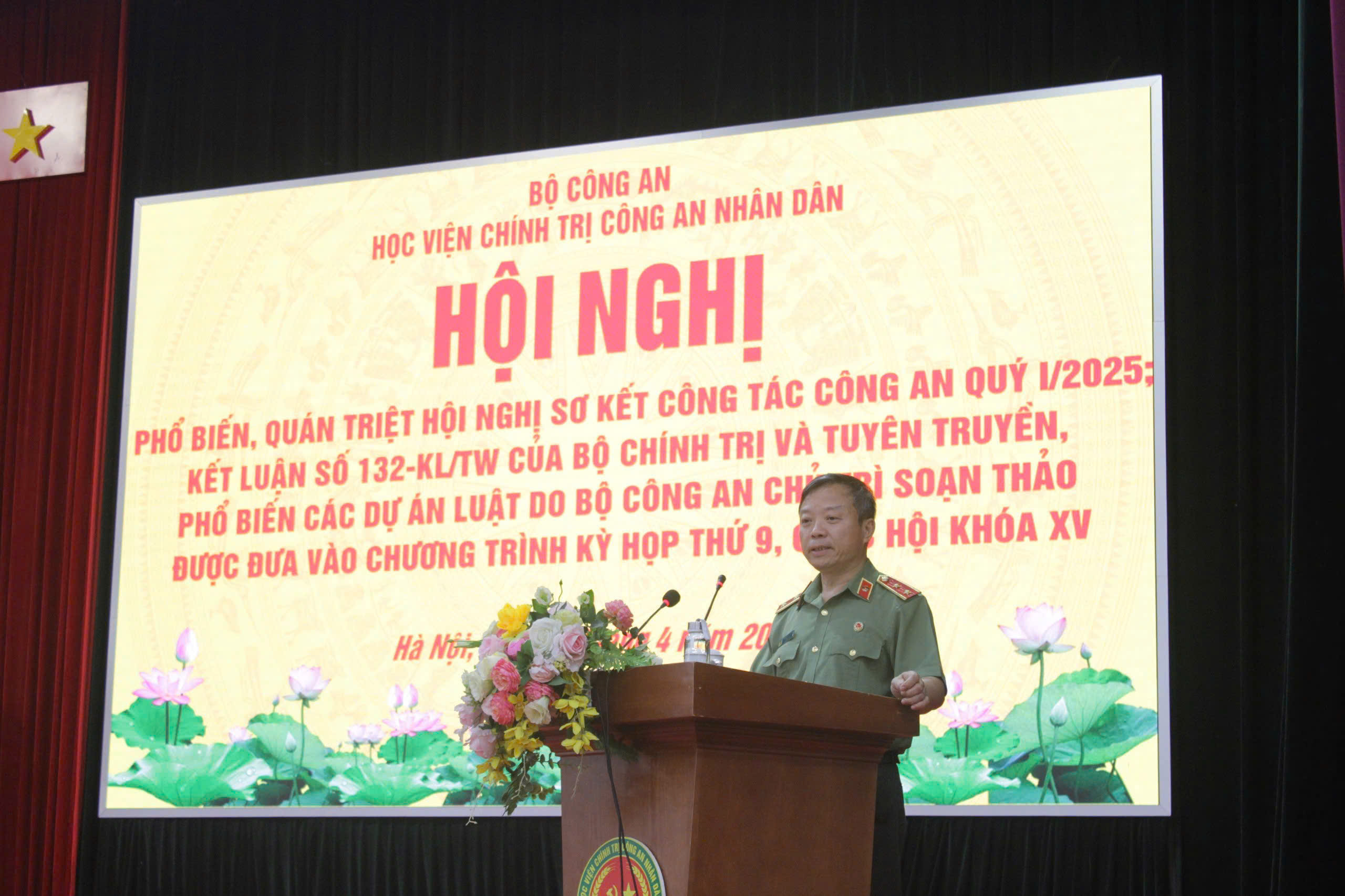 Ngày 29/4/2025, Học viện Chính trị Công an nhân dân tổ chức Hội nghị phổ biến, quán triệt nội dung Hội nghị sơ kết công tác Công an Quý I năm 2025; Kết luận số 132-KL/TW ngày 18/3/2025 của Bộ Chính trị về tiếp tục thực hiện Chỉ thị số 36-CT/TW ngày 16/8/2019 của Bộ Chính trị về tăng cường, nâng cao hiệu quả công tác phòng chống, kiểm soát ma túy và tuyên truyền, phổ biến các dự luật do Bộ Công an chủ trì, soạn thảo được đưa vào chương trình kỳ họp thứ 9, Quốc hội khóa XV. Đồng chí PGS.TS Trung tướng Phan Xuân Tuy, Bí thư Đảng ủy, Giám đốc Học viện Chính trị CAND chủ trì và báo cáo viên tại Hội nghị. Tham dự Hội nghị có các đồng chí trong Ban Thường vụ, Ban Giám đốc Học viện; đại diện lãnh đạo các đơn vị chức năng thuộc Học viện cùng toàn thể cán bộ, giảng viên Học viện.
