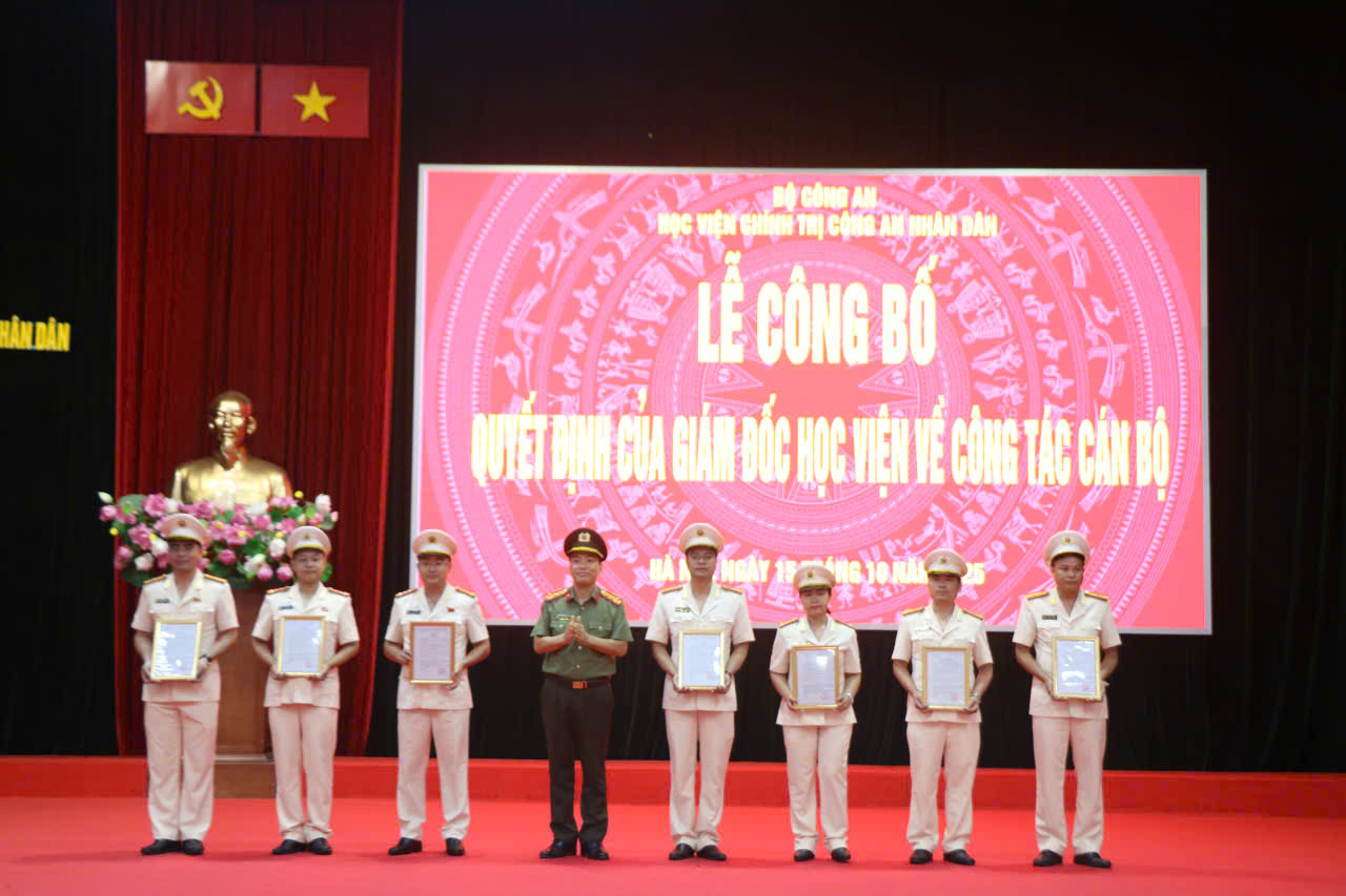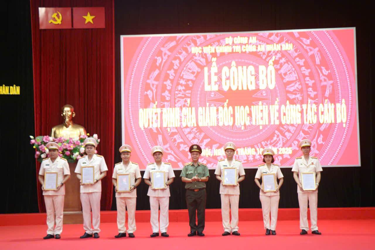 Ngày 15/10/2025, Học viện Chính trị CAND đã trang trọng tổ chức Lễ công bố các quyết định về công tác cán bộ; đồng chí Trung tướng, PGS.TS Phan Xuân Tuy, Bí thư Đảng ủy, Giám đốc Học viện chủ trì buổi lễ; tham dự buổi lễ có các đồng chí trong Ban Thường vụ, Đảng ủy, Ban Giám đốc Học viện, cấp ủy, lãnh đạo các đơn vị thuộc Học viện và toàn thể đội ngũ cán bộ, giảng viên.