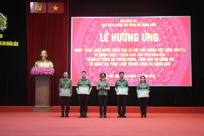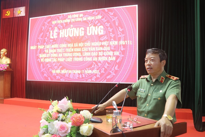 Sáng 09/11/2022, Học viện Chính trị CAND tổ chức Lễ hưởng ứng ngày pháp luật Nước CHXHCN Việt Nam và quán triệt, triển khai các văn bản của Đảng ủy Công an trung ương, lãnh đạo Bộ Công an về công tác pháp luật trong CAND. Đồng chí Trung tướng, PSG.TS Phan Xuân Tuy, Bí thư Đảng ủy, Giám đốc Học viện dự và chủ trì buổi lễ. Tham dự buổi lễ có đồng chí Thiếu tướng, PGS.TS Đinh Ngọc Hoa, Phó Bí thư Đảng ủy Học viện , đại diện phòng chức năng V03, lãnh đạo các đơn vị cùng toàn thể cán bộ, giảng viên, của Học viện.