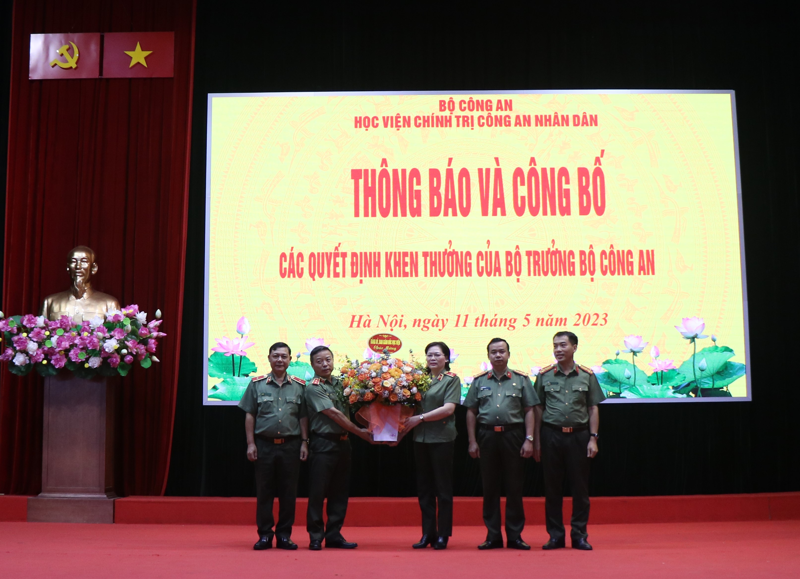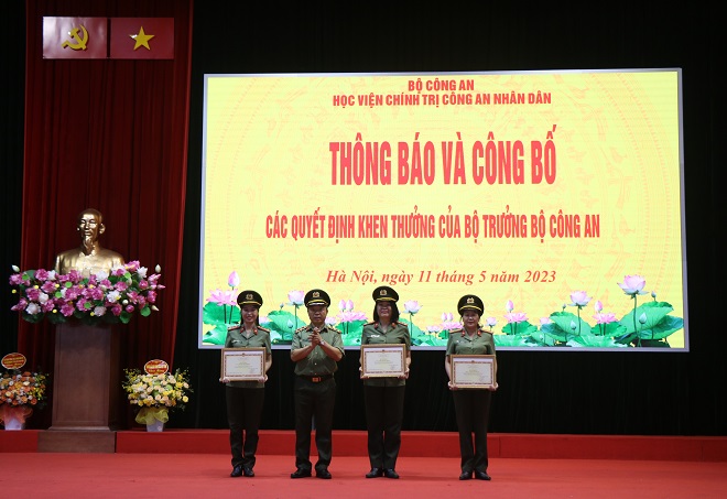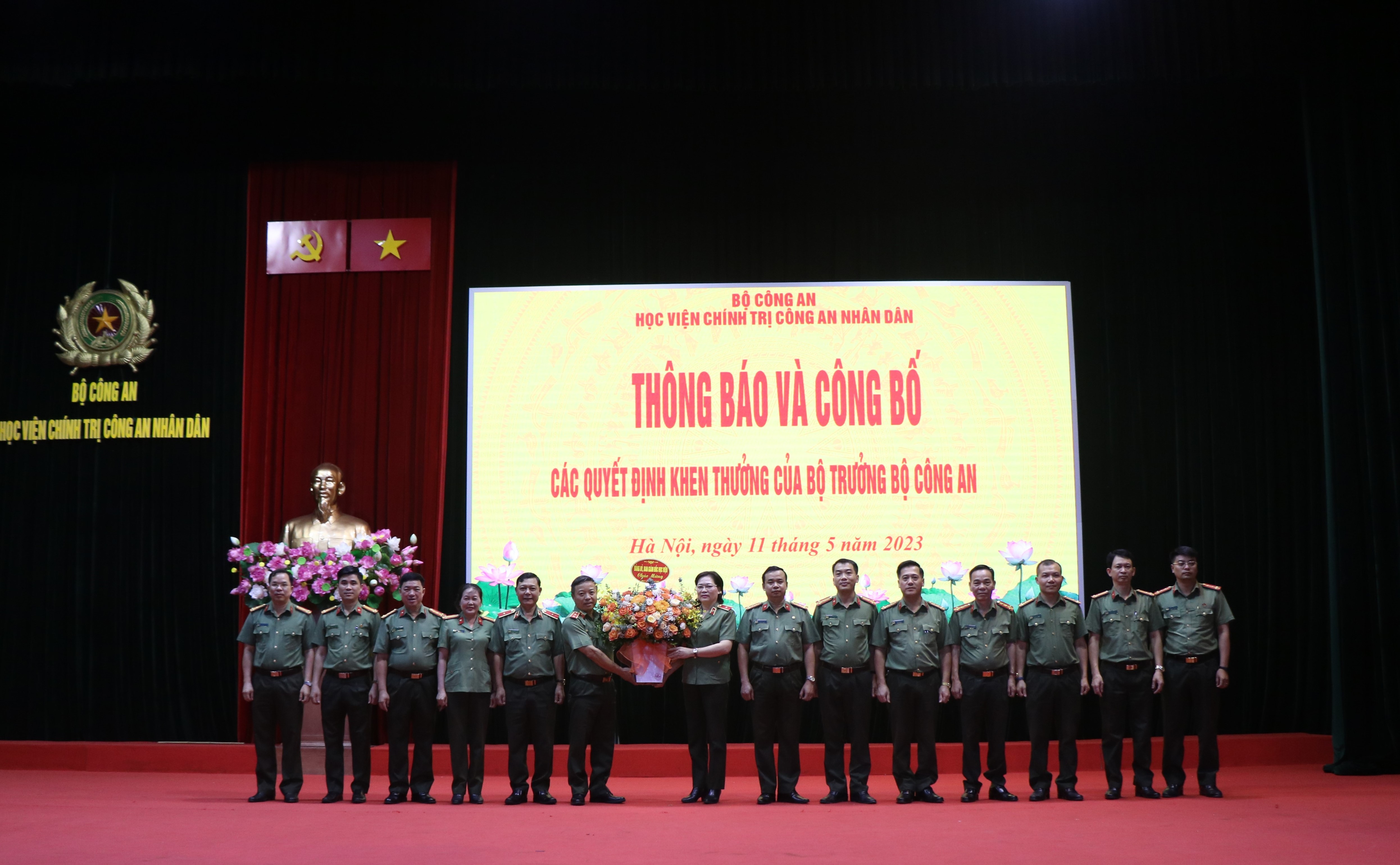 Đồng thời, nhằm tôn vinh, ghi nhận những thành tích đạt được của tập thể thuộc Học viện, ngày 30/11/2022, Bộ trưởng Công an đã Ký quyết định số 9008/QĐ-BCA và ngày 09/12/2022, duyệt ký Quyết định số 9279/QĐ-BCA-X03 về việc tặng Cờ thi đua của Bộ Công an cho tập thể Văn phòng Học viện và Phòng Chính trị đã có thành tích xuất sắc trong phong trào “Vì an ninh Tổ quốc” năm học 2021-2022, góp phần bảo đảm an ninh quốc gia, giữ gìn trật tự, an toàn xã hội. Cũng trong chương trình, Học viện đã tổ chức công bố và chúc mừng 03 giảng viên Học viện được tặng Bằng khen của Bộ Công an đạt danh hiệu Giảng viên dạy giỏi cấp Bộ năm 2022, gồm các đồng chí: Trung tá, TS Nguyễn Tuyết Lan, Trưởng khoa, Khoa khoa học xã hội, nhân văn và Tâm lý; Đại uý, TS Phan Thị Thu Trang, Phó Trưởng khoa, Khoa khoa học xã hội nhân văn và Tâm lý; Đại uý, TS Nguyễn Thị Thanh Nga, giảng viên Khoa Luật.