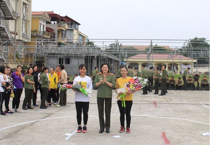 | Đồng chí Đại tá PGS. TS Đinh Ngọc Hoa, Phó Giám đốc Học viện Chính trị Công an nhân dân và các đại biểu chụp ảnh lưu niệm cùng Ban Chấp hành Hội Phụ nữ Học viện và các đội thi đấu |