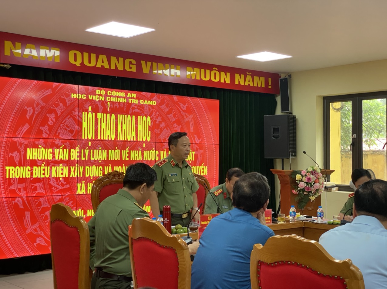 Hướng đến đánh giá một năm thực hiện Nghị quyết số 27/NQ-TW ngày 09-11-2022 Hội nghị lần thứ sáu Ban Chấp hành Trung ương Đảng khóa XIII về tiếp tục xây dựng và hoàn thiện Nhà nước pháp quyền xã hội chủ nghĩa Việt Nam trong giai đoạn mới; hưởng ứng Ngày Pháp luật Việt Nam 09/11/2023 và thực hiện chương trình, kế hoạch công tác năm học 2023-2024, triển khai các hoạt động nghiên cứu khoa học và công nghệ, ngày 06/11/2023 tại Học viện Chính trị Công an nhân dân đã tổ chức Hội thảo khoa học với chủ đề “Những vấn đề lý luận mới về nhà nước và pháp luật trong điều kiện xây dựng và hoàn thiện Nhà nước pháp quyền xã hội chủ nghĩa Việt Nam”. Trung tướng, PGS, TS. Phan Xuân Tuy, Ủy viên Hội đồng Lý luận Bộ Công an, Bí thư Đảng uỷ, Giám đốc Học viện Chính trị Công an nhân dân chủ trì Hội thảo. Đại tá, TS. Trần Văn Tuấn, Phó Giám đốc Học viện đồng chủ trì Hội thảo.