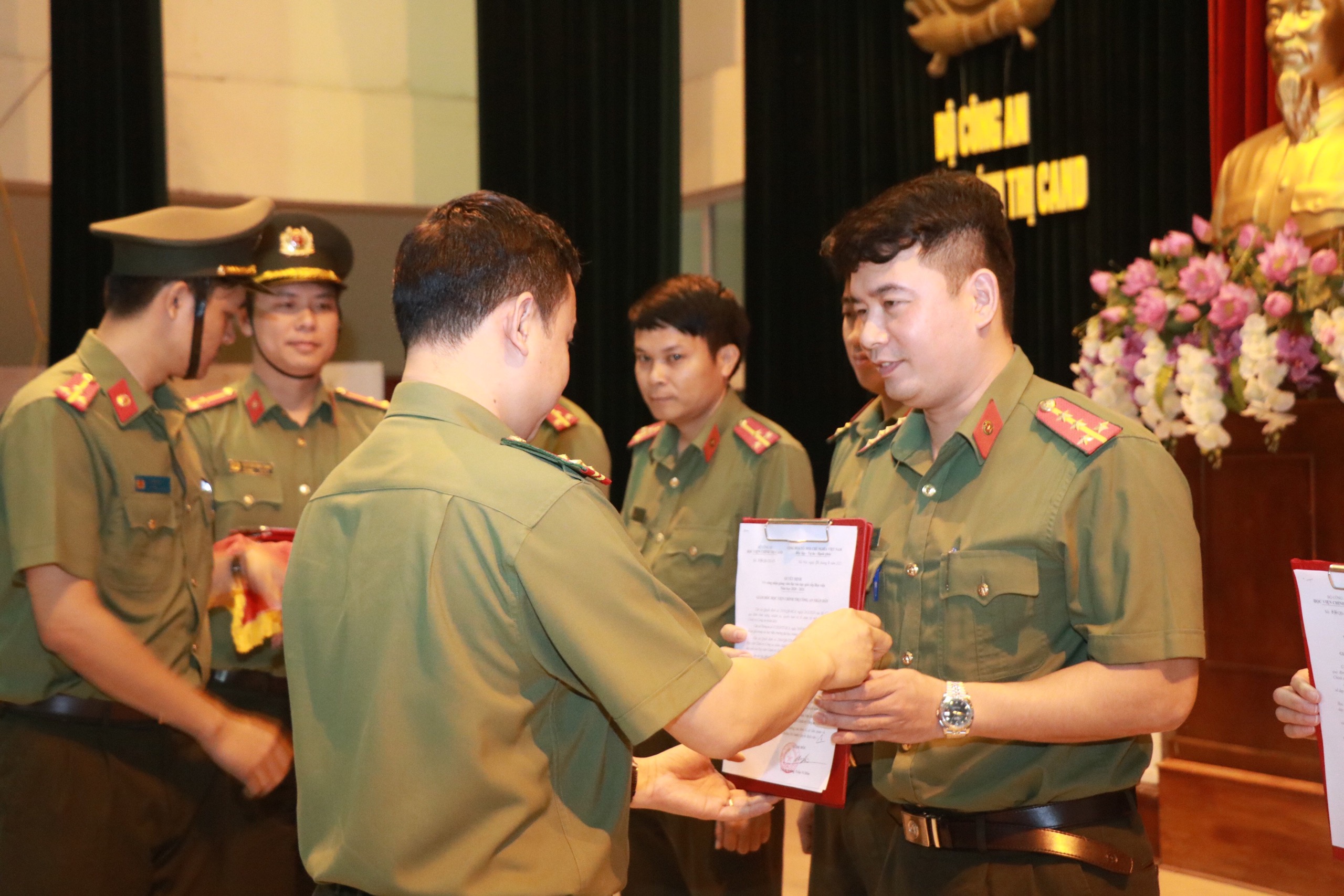 Đồng chí Thiếu tướng, PGS.TS Đinh Ngọc Hoa, Phó Bí thư Đảng ủy, Phó Giám đốc Học viện, Phó Trưởng Ban Tổ chức Hội thi trao các quyết định công nhận đạt Bài dạy giỏi cấp Học viện năm học 2020 - 2021