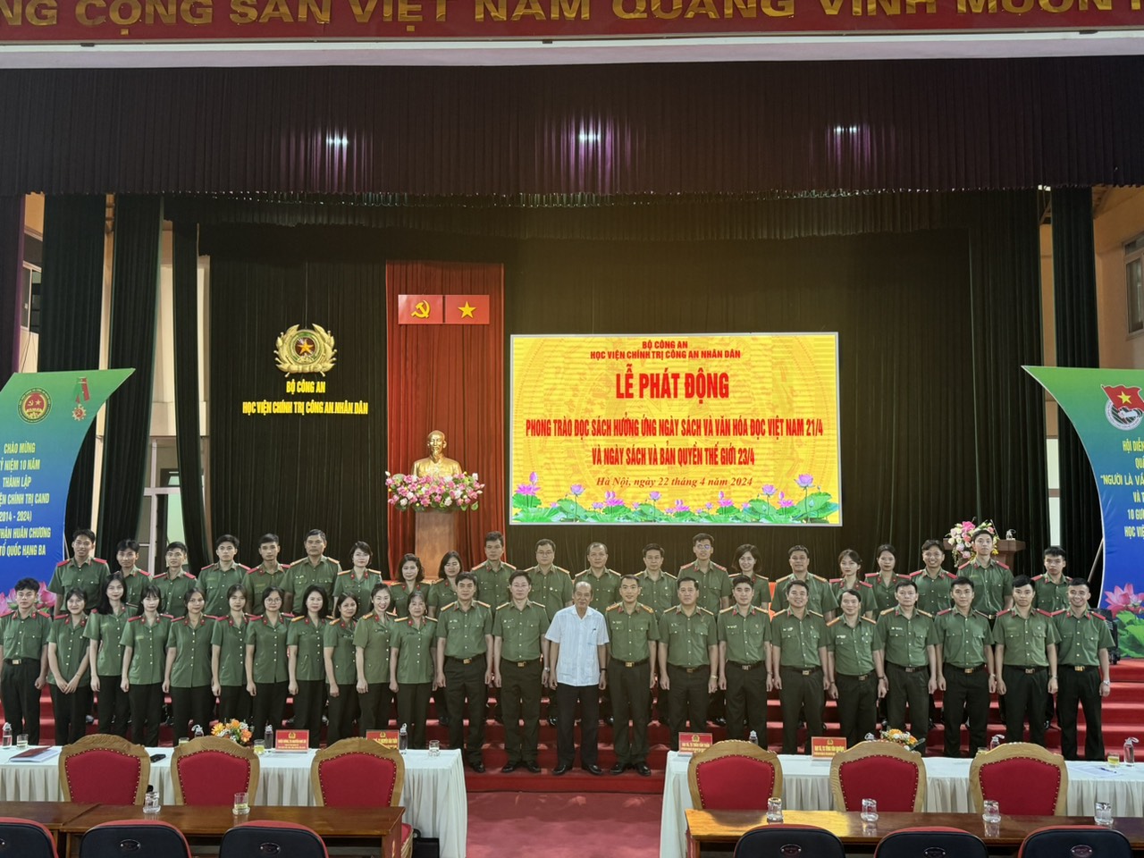 Ngày 22/4/2024, Học viện Chính trị Công an nhân dân tổ chức Lễ phát động phong trào đọc sách nhân kỷ niệm ngày Sách và Văn hóa đọc Việt Nam 21/4; ngày Sách và Bản quyền thế giới 23/4. Đồng chí Thượng tá, TS Nguyễn Văn Tuấn, Ủy viên Ban Thường vụ Đảng ủy, Phó Giám đốc Học viện thừa ủy quyền của đồng chí Giám đốc Học viện dự chủ trì Lễ phát động. Dự Lễ phát động có lãnh đạo các đơn vị và cán bộ, giảng viên, học viên của Học viện. Đặc biệt, Học viện Chính trị Công an nhân dân đã mời đồng chí Nguyễn Đức Hà, nguyên Vụ trưởng Vụ Cơ sở Đảng, Ban Tổ chức Trung ương đến giới thiệu với cán bộ, giảng viên và học viên của Học viện cuốn sách “Đổi mới phương thức lãnh đạo của Đảng đối với Công an nhân dân đáp ứng yêu cầu xây dựng lực lượng Công an nhân dân thật sự trong sạch, vững mạnh, chính quy, tinh nhuệ, hiện đại” do đồng chí Đại tướng, GS.TS Tô Lâm, Ủy viên Bộ Chính trị, Bộ trưởng Bộ Công an chủ biên.