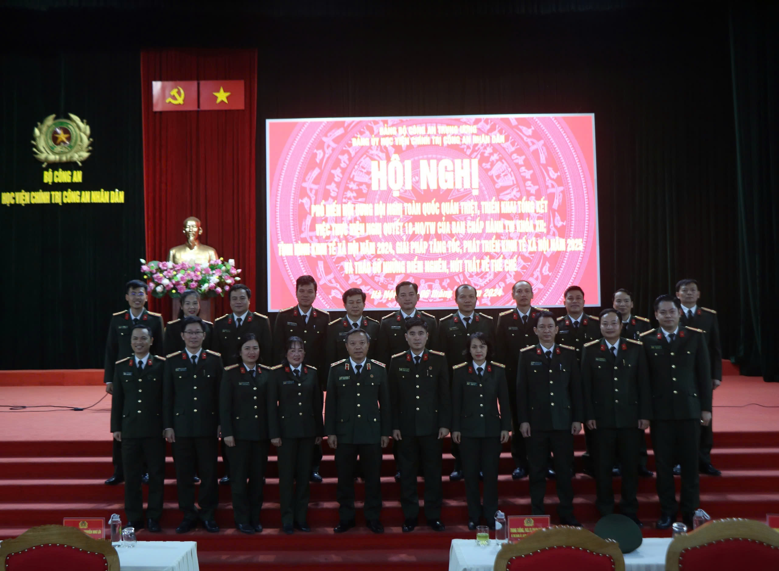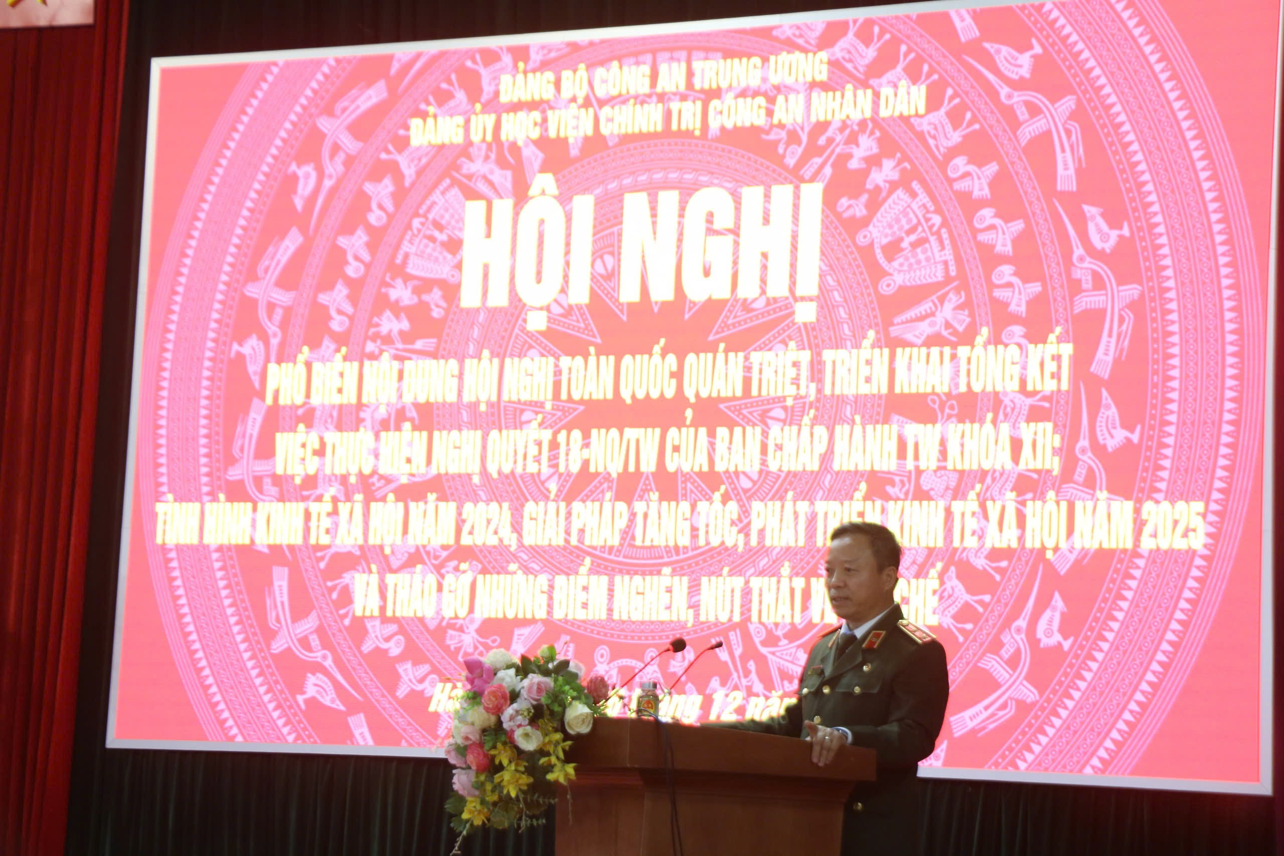 Ngày 6/12/2024, Học viện Chính trị Công an nhân dân tổ chức Hội nghị quán triệt, triển khai tổng kết việc thực hiện Nghị quyết số 18-NQ/TW, ngày 25/10/2017 của Ban Chấp hành Trung ương Đảng khóa XII; tình hình kinh tế xã hội năm 2024, giải pháp tăng tốc, phát triển kinh tế năm 2025 và tháo gỡ những điểm nghẽn, nút thắt về thể chế. Đồng chí PGS.TS, NGƯT, Trung tướng Phan Xuân Tuy, Bí thư Đảng ủy, Giám đốc Học viện chủ trì Hội nghị. Tham dự Hội nghị còn có các đồng chí trong Đảng ủy, Ban Giám đốc Học viện cùng toàn thể lãnh đạo, cán bộ, giảng viên Học viện.