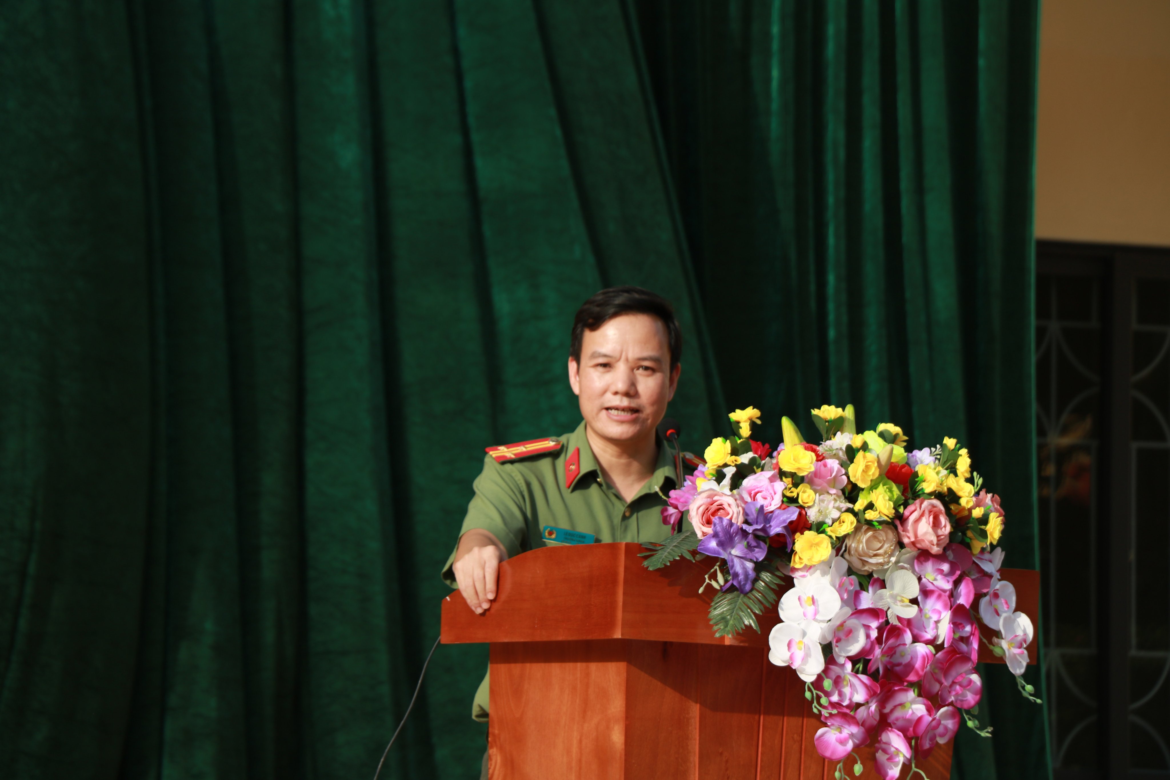 Đồng chí Thượng tá Lê Đức Cảnh, Trưởng Khoa Luật, Học viện Chính trị Công an nhân dân phát biểu tại buổi tuyên truyền, phổ biến pháp luật
